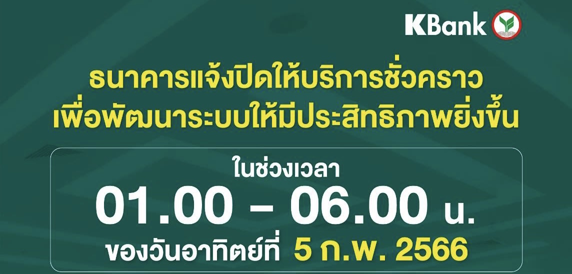 ธนาคารกสิกรไทย ตระหนักถึงความสำคัญในการทำธุรกรรมของลูกค้า เพื่อเพิ่มประสิทธิภาพในการบริการให้ดียิ่งขึ้นและรองรับการทำธุรกรรมที่เพิ่มขึ้นในอนาคต ธนาคารมีความจำเป็นที่จะต้องทำการปิดปรับปรุงบริการเป็นการชั่วคราว ในวันอาทิตย์ที่ 5 กุมภาพันธ์ 2566 ช่วงเวลา 01:00 น. – 06:00 น. ส่งผลให้ลูกค้าไม่สามารถใช้บริการดังนี้ได้