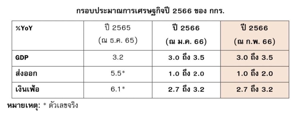 เศรษฐกิจไทยมีแรงสนับสนุนจากภาคการท่องเที่ยวแต่มีความเสี่ยงจากภาคการส่งออก โดยจำนวนนักท่องเที่ยวต่างชาติในปีนี้อาจมากถึง 26-26 ล้านคน จากเดิมที่ประเมินไว้ 22.5 ล้านคน จากนักท่องเที่ยวกลุ่มยุโรป และสหรัฐฯ ที่มีแนวโน้มฟื้นตัวได้ดีกว่าคาด ขณะที่นักท่องเที่ยวจีนจะปรับตัวดีขึ้นอย่างชัดเจนในไตรมาสที่ 2 อย่างไรตาม การส่งออกมีแนวโน้มชะลอตัวในช่วงต้นปี และต้องติดตามปัจจัยที่มีผลกระทบอย่างใกล้ชิด ไม่ว่าจะเป็นการแข็งค่าของค่าเงินบาท การชะลอตัวของเศรษฐกิจโลก ซึ่งแม้ว่าจีนจะฟื้นตัวได้เร็วแต่อาจไม่เพียงพอที่จะทดแทนความต้องการสินค้าจากประเทศหลักอื่นๆ กกร.จึงคงกรอบประมาณการเศรษฐกิจปี 2566 เท่าเดือนมกราคม คือ GDP โตในกรอบ 3.0 – 3.5 ส่งออก 1.0 – 2.0 และเงินเฟ้ออยู่ที่ 2.7 – 3.2