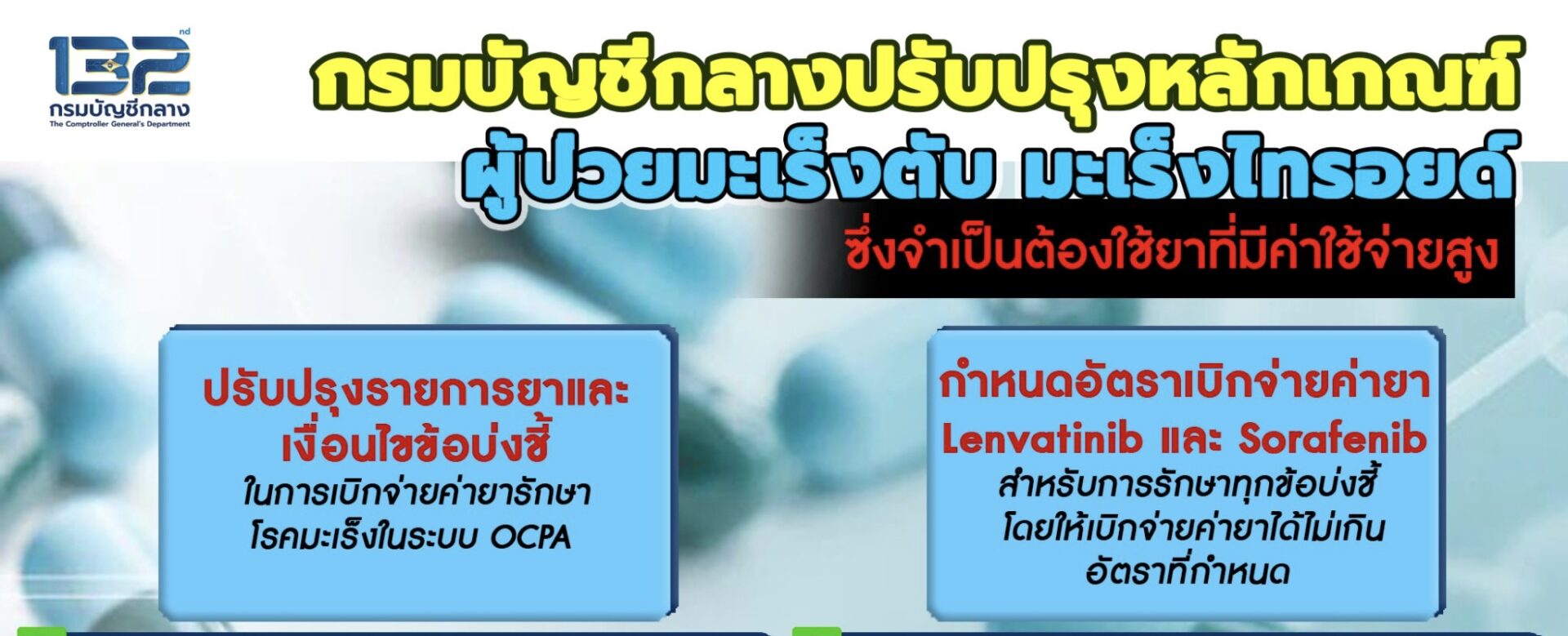นางสาวกุลยา ตันติเตมิท อธิบดีกรมบัญชีกลาง เปิดเผยว่า กรมบัญชีกลางได้ปรับปรุงและพัฒนาระบบเบิกจ่ายค่ายากลุ่มโรคที่มีค่าใช้จ่ายสูงเพื่อให้ผู้ป่วยได้รับการรักษาพยาบาลตามความเหมาะสม จำเป็น และมีประสิทธิภาพมากขึ้น รวมทั้งเพื่อให้การเบิกจ่ายค่ารักษาพยาบาลเป็นไปอย่างสมเหตุผล ได้ปรับปรุง ดังนี้ 1. ปรับปรุงรายการยาและเงื่อนไขข้อบ่งชี้ในการเบิกจ่ายค่ายารักษาโรคมะเร็งในระบบ OCPA ด้วยการปรับปรุงเงื่อนไขข้อบ่งชี้ในการเบิกจ่ายค่ายา รักษาโรคมะเร็งตับ และโรคมะเร็งไทรอยด์ระยะแพร่กระจาย