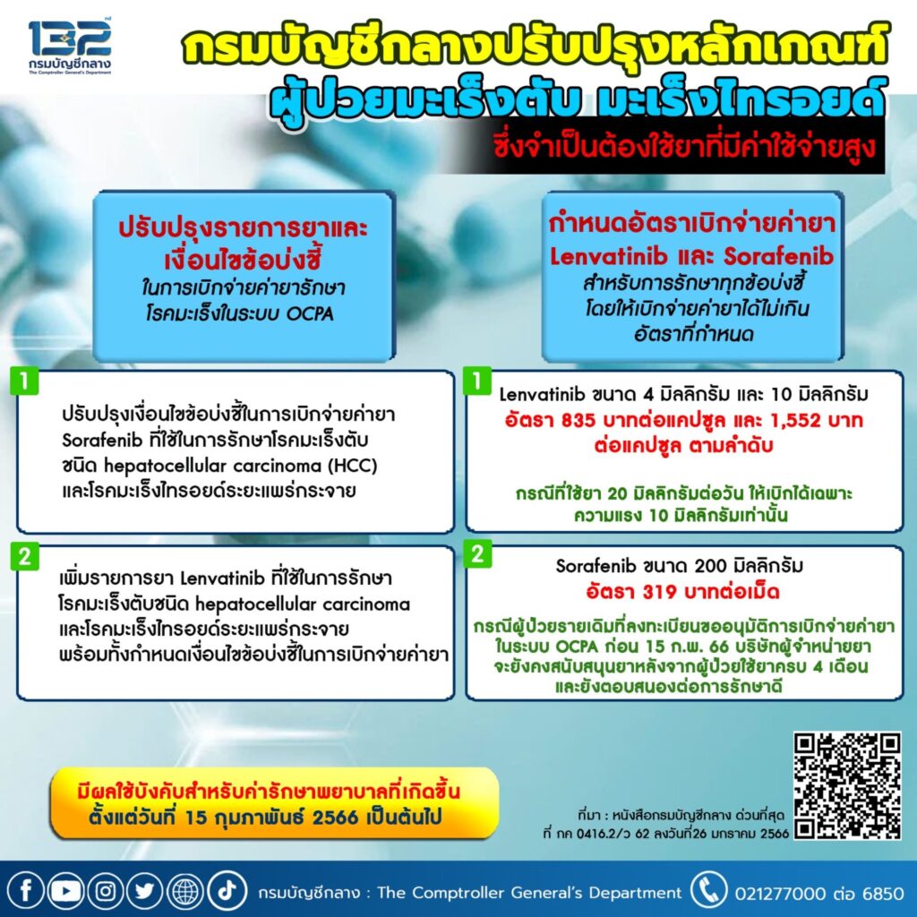 และเพิ่มรายการยา Lenvatinib ที่ใช้ในการรักษาโรคมะเร็งตับ ชนิด hepatocellular carcinoma และโรคมะเร็งไทรอยด์ระยะแพร่กระจาย พร้อมทั้งกำหนดเงื่อนไขข้อบ่งชี้ในการเบิกจ่ายค่ายา สถานพยาบาลจะต้องดำเนินการลงทะเบียนแพทย์ผู้ทำการรักษา และผู้ป่วย และส่งข้อมูลตามโปรโตคอลที่กำหนดในระบบ OCPA เพื่อขออนุมัติเบิกค่ายา หรือขอต่ออายุการเบิกค่ายา หรือขอหยุดการใช้ยา ตามแนวทางที่หน่วยงานซึ่งได้รับมอบหมายจากกรมบัญชีกลางกำหนด และให้เบิกจ่ายค่ายาในระบบเบิกจ่ายตรงค่ารักษาพยาบาลเท่านั้น รวมทั้งการใช้ยาดังกล่าวต้องเป็นไปตามเงื่อนไขข้อบ่งชี้ที่กำหนด จึงจะสามารถเบิกจ่ายจากทางราชการได้