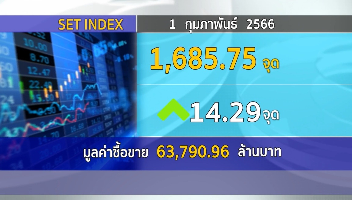 กทม. 1 ก.พ.-SET ปิดวันนี้ที่ 1,685.75 จุด เพิ่มขึ้น 14.29 จุด (+0.85%) มูลค่าการซื้อขาย 63,797.02 ล้านบาท