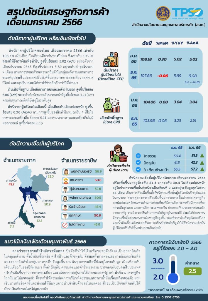 นายวิชานัน นิวาตจินดา รองผู้อำนวยการ สำนักงานนโยบายและยุทธศาสตร์การค้า(สนค.) เปิดเผยว่า ดัชนีราคาผู้บริโภคของไทย เดือนมกราคม เท่ากับ 108.18 เมื่อเทียบกับเดือนเดียวกันของปีก่อน ซึ่งเท่ากับ 103.01 ส่งผลให้อัตราเงินเฟ้อทั่วไป สูงขึ้นร้อยละ 5.02 เมื่อเทียบกับช่วงเดียวกันของปีก่อน ชะลอตัวจากเดือนธันวาคม 2565 ที่สูงขึ้นร้อยละ 5.89 อยู่ระดับตำ่สุดในรอบ 9 เดือน ตามการชะลอตัวของราคาสินค้าในกลุ่มพลังงานและอาหาร ขณะที่อุปสงค์ในประปรับตัวดีขึ้นจากภาคท่องเที่ยว เทศกาลปีใหม่ และตรึษจีน ส่งผลให้การใช้จ่ายคึกคักกว่าปีที่ผ่านมา