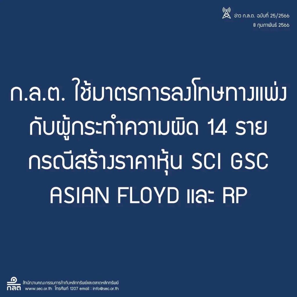 กรุงเทพฯ 8 ก.พ. – ก.ล.ต. ใช้มาตรการลงโทษทางแพ่งกับผู้กระทำความผิด 14 ราย กรณีสร้างราคาหุ้น SCI GSC ASIAN FLOYD และ RP เรียกให้ชำระเงินรวม 27,398,667 บาท กำหนดระยะเวลาห้ามซื้อขายหลักทรัพย์และสัญญาซื้อขายล่วงหน้า และห้ามเป็นกรรมการหรือผู้บริหาร