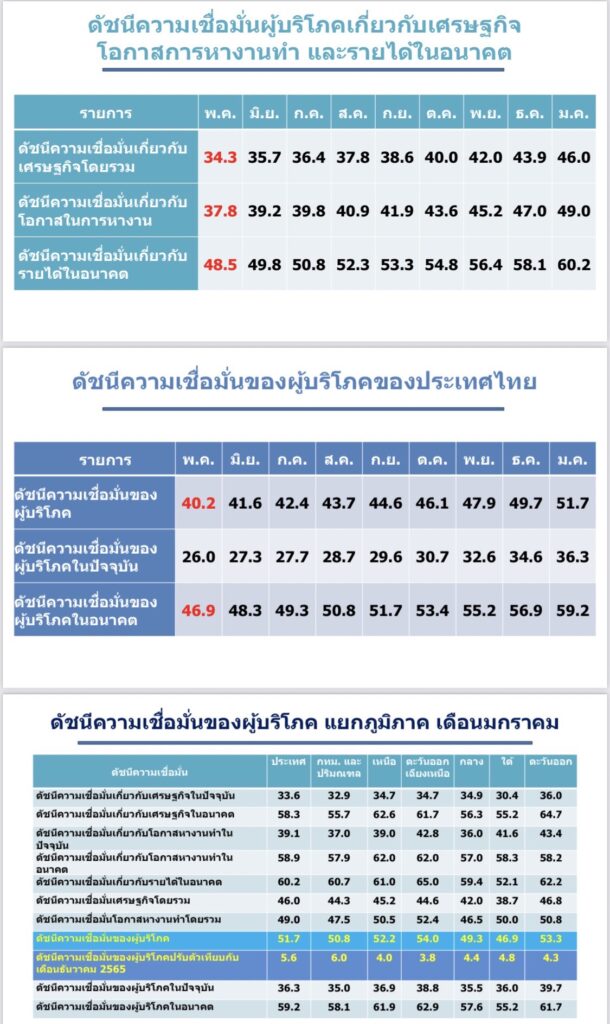 ทั้งนี้ ดัชนีความเชื่อมั่นเกี่ยวกับเศรษฐกิจโดยรวม ดัชนีความเชื่อมั่นเกี่ยวกับโอกาสหางานทำโดยรวม และดัชนีความเชื่อมั่นเกี่ยวกับรายได้ในอนาคตอยู่ที่ระดับ 46.0 49.0 และ 60.2 ตามลำดับ ปรับตัวดีขึ้นทุกรายการเมื่อเทียบกับดัชนีในเดือนธันวาคม 2565 ที่อยู่ในระดับ 43.9 47.0 และ 58.1 ตามลำดับ แสดงว่าผู้บริโภคเริ่มมีความเชื่อมั่นว่าเศรษฐกิจไทยกำลังฟื้นตัวขึ้น แต่มีความกังวลเกี่ยวกับราคาน้ำมันและค่าครองชีพที่ปรับตัวสูงขึ้น ตลอดจนยังคงกังวลในสถานการณ์โควิดในประเทศไทยและทั่วโลกที่ยังคงมีอยู่แม้ว่าจะคลายตัวลง ซึ่งจะส่งผลกระทบให้เศรษฐกิจไทยและการจ้างงานมีโอกาสฟื้นตัวได้ช้าในอนาคต ซึ่งจะทำให้รายได้ในอนาคตของผู้บริโภคมีความไม่แน่นอนสูง
