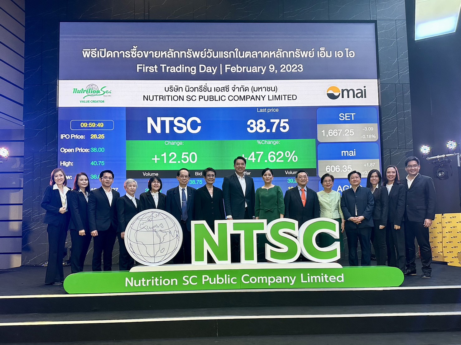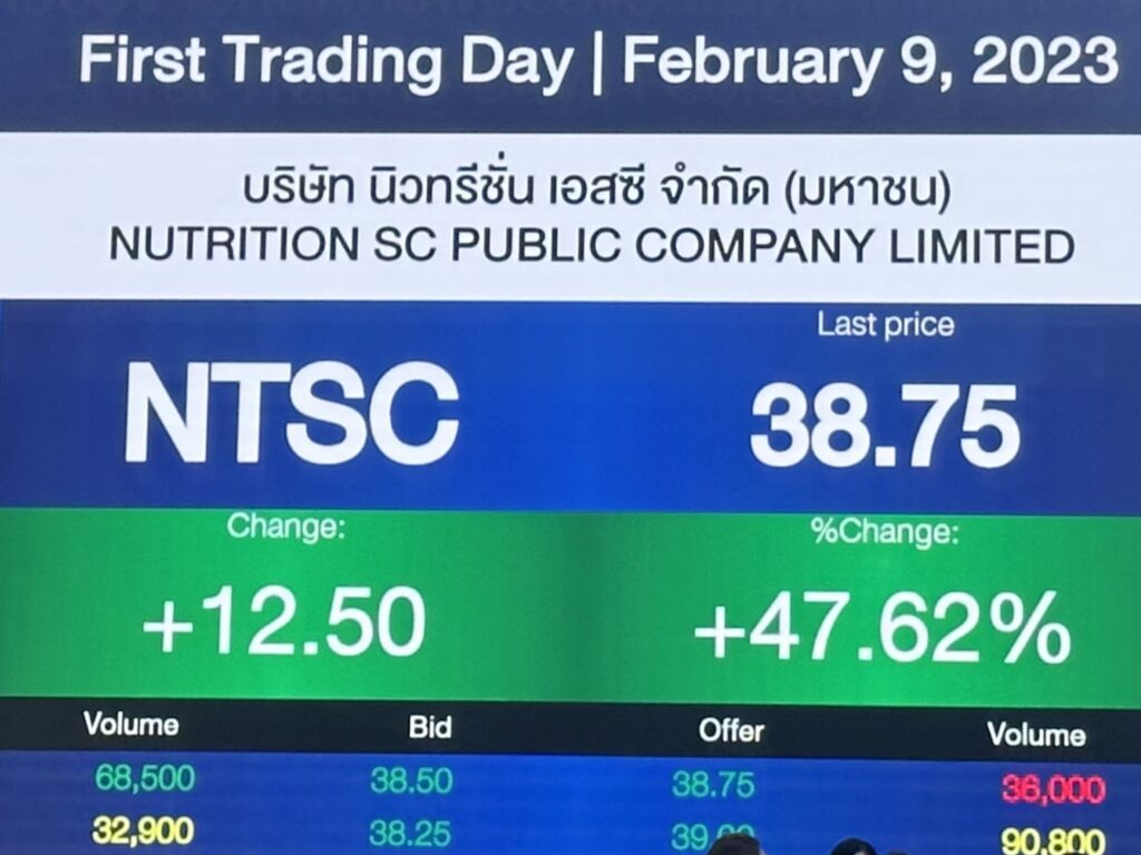 บมจ. นิวทรีชั่น เอสซี เข้าจดทะเบียนและเริ่มซื้อขายในตลาดหลักทรัพย์ เอ็ม เอ ไอ (mai) วันนี้( 9 ก.พ.) ภายใต้กลุ่มอุตสาหกรรมเกษตรและอุตสาหกรรมอาหาร โดยใช้ชื่อย่อในการซื้อขายหลักทรัพย์ว่า “NTSC” เปิดเทรดวันแรกที่ราคา 38 บาท เพิ่มขึ้น 11.75 บาท จากราคา IPO ที่ 26.25 บาท หรือเพิ่มขึ้น 44.76%