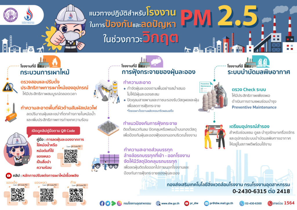 นายจุลพงษ์ ทวีศรี อธิบดีกรมโรงงานอุตสาหกรรม กล่าวว่า ปัจจุบัน กรอ. มีมาตรการในการควบคุมฝุ่นละอองที่ระบายจากการประกอบกิจการโรงงาน โดยออกประกาศกระทรวงอุตสาหกรรม กำหนดให้โรงงานที่เป็นกลุ่มเสี่ยง ได้แก่ โรงงานที่มีกระบวนการที่มีการเผาไหม้ เช่น เตาเผา หม้อน้ำ เตาอบ และเตาหลอม เป็นต้น ดำเนินการติดตั้งอุปกรณ์ตรวจสอบคุณภาพอากาศจากปล่องแบบอัตโนมัติอย่างต่อเนื่อง (CEMS) ซึ่งข้อมูลจากการตรวจวัดนี้จะถูกส่งมาแสดงผลผ่านระบบเฝ้าระวังและเตือนภัยมลพิษระยะไกล (Pollution Online Monitoring System: POMS) บนเว็บไซต์ของ กรอ. และบนมือถือ ผ่าน Application POMS เพื่อให้ประชาชนสามารถติดตามผลการควบคุมการระบายมลพิษอากาศของโรงงานได้ตลอดเวลา อีกทั้งได้นำรถตรวจวัดคุณภาพอากาศเคลื่อนที่ตรวจเฝ้าระวังคุณภาพอากาศในบรรยากาศ โดยการเลือกจุดที่มีอุตสาหกรรมหนาแน่น เช่น นิคมอุตสาหกรรม สวนอุตสาหกรรม เขตประกอบการ เป็นต้น และขอความร่วมมือผู้ประกอบการโรงงาน ให้ตรวจสอบและบำรุงรักษาเครื่องจักร ตรวจสอบระบบบำบัดมลพิษอากาศให้อยู่ในสภาพที่ใช้งานได้ดี วางแผนกำลังการผลิต และควบคุมการระบายมลพิษอากาศจากการประกอบกิจการอย่างเข้มงวดเพื่อลดปัญหาฝุ่น PM2.5 ในช่วงเดือนพฤศจิกายน 2565 – กุมภาพันธ์ 2566 เพราะเป็นช่วงที่อากาศอาจไม่ไหลเวียนตามปกติ ทำให้ค่าฝุ่น PM2.5 พุ่งสูง
