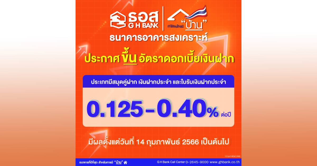 10 ก.พ. – ธนาคารอาคารสงเคราะห์ (ธอส.) ประกาศปรับขึ้นอัตราดอกเบี้ยเงินฝากประเภทมีสมุดคู่ฝาก เงินฝากประจำ และใบรับเงินฝากประจำ 0.125 – 0.40% ต่อปี มีผลตั้งแต่วันที่ 14 กุมภาพันธ์ 2566 เป็นต้นไป