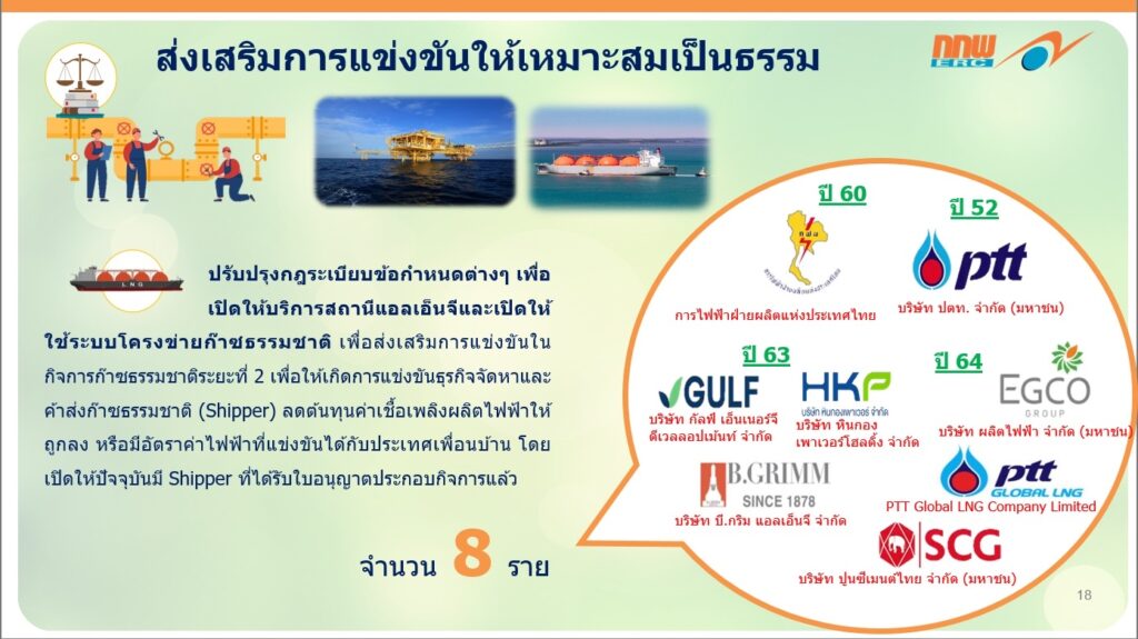 นายวัฒนพงษ์ คุโรวาท ผู้อำนวยการสำนักงานนโยบายและแผนพลังงาน (สนพ. ) กล่าวว่า ในส่วนของโรงไฟฟ้าที่มีสัญญาซื้อขายกับรัฐ จะอยู่ในตลาดไฟฟ้า Regulated Market ซึ่งชิปเปอร์จะต้องมีสัญญาขายชัดเจน ป้องกันการขาดแคลน มีการกำกับตั้งระบบโดย กกพ. ในขณะที่ กรณีโรงไฟฟ้าอื่นๆ หรือการนำเข้ามาขายในอุตสาหกรรมต่างๆ จะอยู่ในกลุ่มที่จัดหา LNG เพื่อใช้กับโรงไฟฟ้าที่ไม่ได้ขายไฟฟ้าเข้าระบบ ภาคอุตสาหกรรมและกิจการของตนเอง หรือPartially Regulated Market ซึ่ง Shipper สามารถกำหนดราคาขายได้โดยอิสระ อย่างไรก็ตามทุกตลาดจะต้องมีการจ่ายค่าใช้ทรัพย์สินของ ปตท. เช่นท่อขนส่ง ท่าเรือ คลังแอลเอ็นจี ตามที่ กกพ.กำหนด ส่วน จะมีชิปเปอร์รายใหม่ๆ เกิดขึ้นในอนาคตหรือไม่นั้น เรื่องี้เป็นหน้าที่ของ กกพ.กำหนด