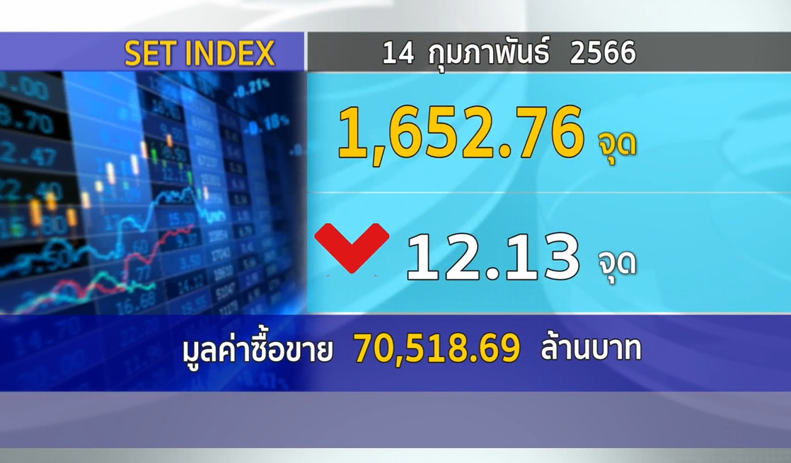 กทม. 14 ก.พ.-SET ปิดวันนี้ที่ 1,652.76 จุด ลดลง 12.13 จุด (-0.73%) มูลค่าการซื้อขาย 70,518.69 ล้านบาท