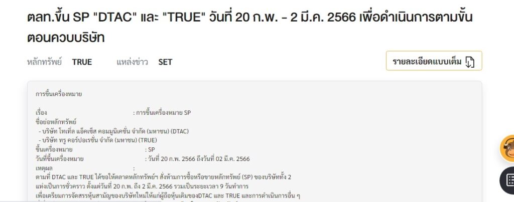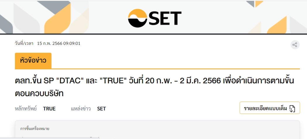 ตลาดหลักทรัพย์แห่งประเทศไทย แจ้งว่าเป็นไปตามที่ DTAC และ TRUE ได้ขอให้ ตลท.สั่งห้ามการซื้อหรือขายหลักทรัพย์ (SP) ของบริษัททั้ง 2 แห่งเป็นการชั่วคราว ตั้งแต่วันที่ 20 ก.พ. ถึง 2 มี.ค. 2566 รวมเป็นระยะเวลา 9 วันทำการ เพื่อเตรียมจัดสรรหุ้นสามัญของบริษัทใหม่ให้แก่ผู้ถือหุ้นเดิมของ DTAC และ TRUE และการดำเนินการอื่น ๆที่เกี่ยวข้อง รวมถึงการนำหุ้นสามัญของบริษัทใหม่เข้าจดทะเบียนในตลาดหลักทรัพย์ฯ ดังนั้น ตลท.จะสั่งห้ามซื้อขายหลักทรัพย์ของ DTAC และ TRUE เป็นการชั่วคราว
