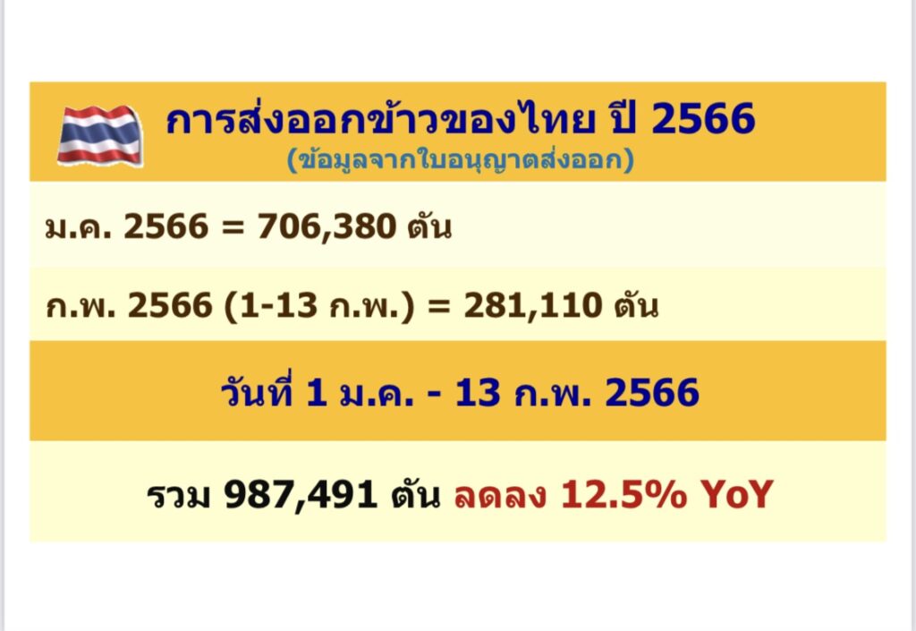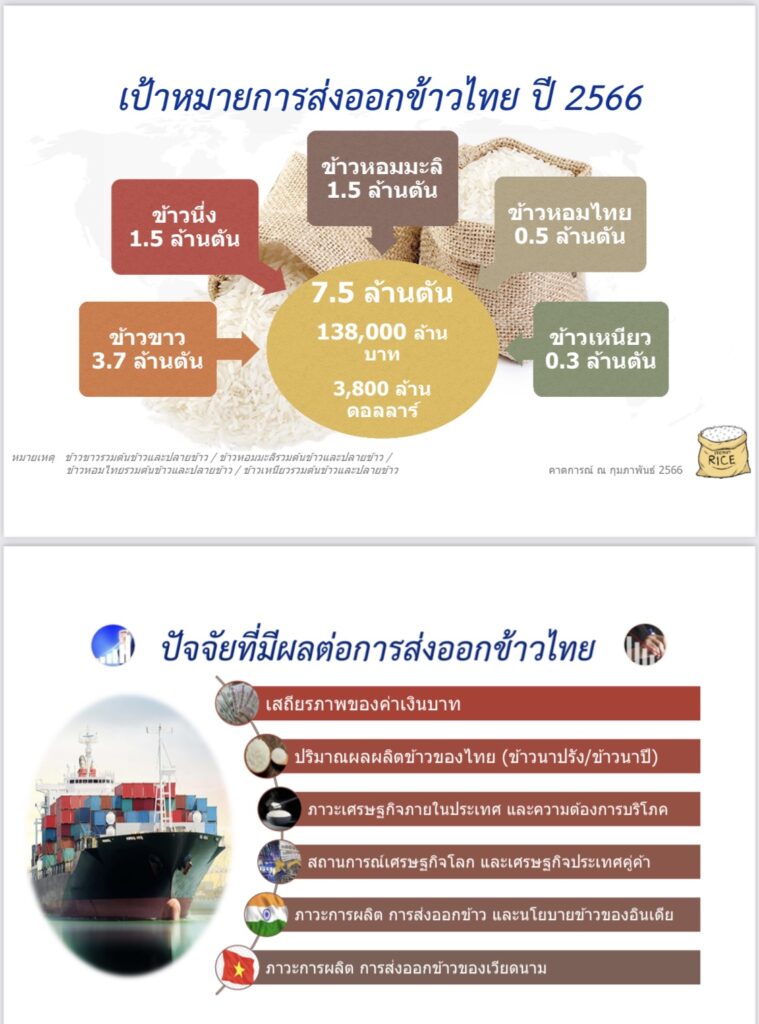 ร้อยตำรวจโท เจริญ เหล่าธรรมทัศน์ นายกสมาคมผู้ส่งออกข้าวไทย กล่าวว่า ขณะนี้ทิศทางการส่งออกข้าวไทยเริ่มกลับมาเป็นปกติจากช่วงก่อนเกิดสถานการณ์โควิดแล้ว จากปี 2563 ไทยส่งออกข้าวได้เพียง 5.7 ล้านตัน ปี 2564 ที่ 6.2 ล้านตัน และเริ่มกลับมาสู่ภาวะปกติ ในปี 2565 ที่ผ่านมา ไทยส่งออกข้าวได้กว่า 7.6 ล้านตัน มูลค่ากว่า 3,900 ล้านดอลลาร์สหรัฐ เป็นผู้ส่งออกข้าว อันดับ 2 ของโลก รองจากอินเดีย ที่ส่งออกได้กว่า 22 ล้านตัน อันดับ 3 เวียดนาม กว่า 7.1 ล้านตัน และในปีนี้ผลผลิตข้าวน่าจะดี เนื่องจากปริมาณทั้งน้ำฝนและน้ำในเขื่อนมีมาก จึงได้ตั้งเป้าการส่งออกข้าวไทยที่ 7.5 ล้านตัน