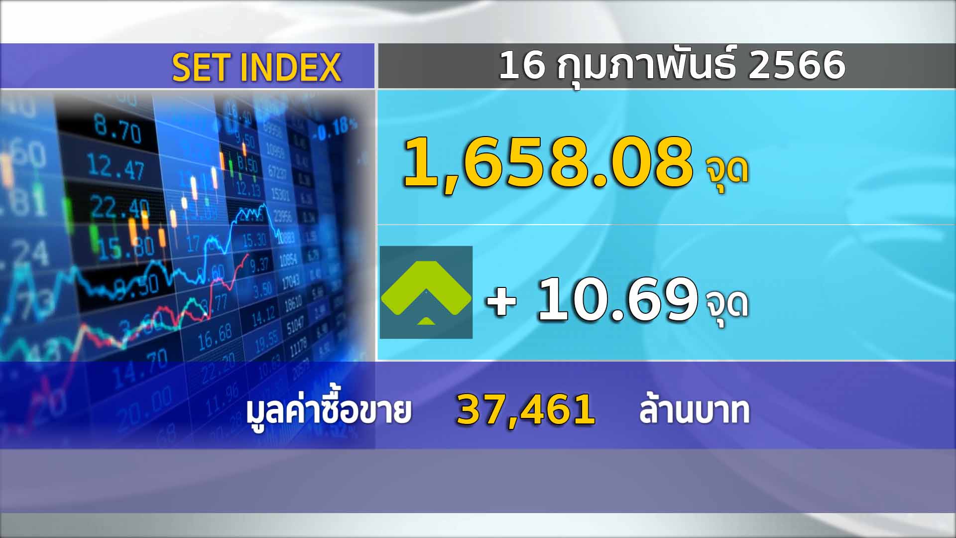 กทม. 16 ก.พ.- SET ปิดช่วงเช้านี้ 1,658.08 จุด เพิ่มขึ้น 10.69 จุด (+0.65%) มูลค่าการซื้อขายราว 37,461 ล้านบาท