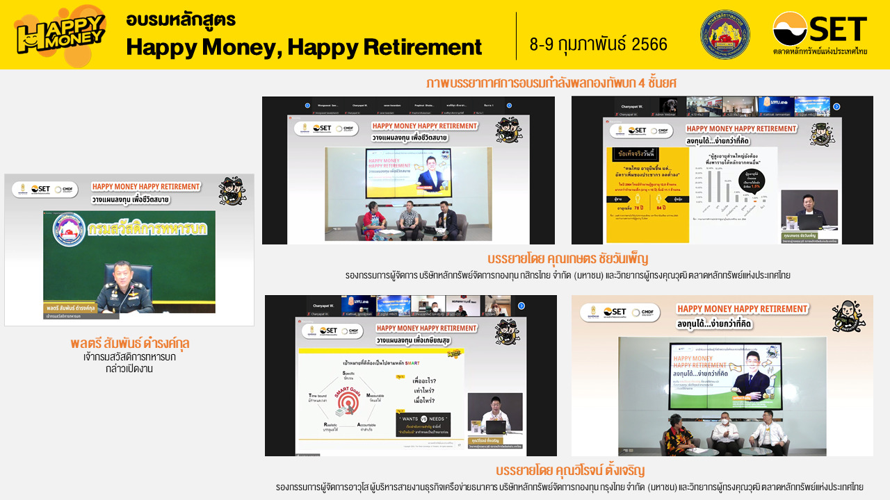 เมื่อเร็วๆนี้ ตลาดหลักทรัพย์แห่งประเทศไทย ร่วมกับ กรมสวัสดิการทหารบก กองทัพบก จัดอบรมหลักสูตร “Happy Money, Happy Retirement” โดยมี พลตรี สัมพันธ์ ดำรงค์กุล เจ้ากรมสวัสดิการทหารบก เป็นประธานเปิดการอบรม พร้อมด้วยวิทยากรผู้ทรงคุณวุฒิตลาดหลักทรัพย์ฯ บรรยายให้ความรู้ แก่กำลังพลกองทัพบก 4 ชั้นยศ จำนวน 262 นาย เพื่อส่งเสริมความรู้ความเข้าใจด้านการเงินและการลงทุน พร้อมเสวนาแลกเปลี่ยนเรียนรู้จากบุคคลตัวอย่าง เพื่อนำการบริหารจัดการเงิน และวางแผนการออมไปประยุกต์ใช้ให้เหมาะกับตนเอง เตรียมพร้อมเกษียณสุขได้ในอนาคต โดยกำลังพลสามารถรับชมย้อนหลังได้ผ่าน Line OA และ Facebook Group คุณจ่ามารวยกัน นายสิบหยิบเงินล้าน และนายร้อยนายพันเงินงอก