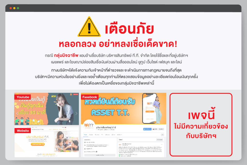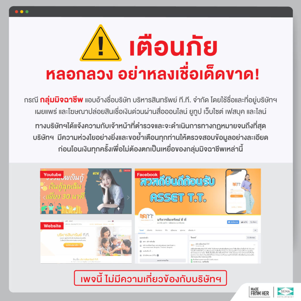 นางสาวเกษรา ธัญลักษณ์ภาคย์ กรรมการผู้จัดการ บริษัท เสนาดีเวลลอปเมนท์ จำกัด (มหาชน) ในฐานะตัวแทนของบริษัทและครอบครัวธัญลักษณ์ภาคย์ เปิดเผยว่า กรณีที่มีกลุ่มมิจฉาชีพ แอบอ้างชื่อบริษัท บริหารสินทรัพย์ ที.ที. จำกัด โดยสวมสิทธิ์ทั้งการใช้ชื่อบริษัท เลขที่ผู้เสียภาษี ที่ตั้งบริษัท ฯลฯ ออกโฆษณาประชาสัมพันธ์การดำเนินธุรกิจการปล่อยสินเชื่อเงินด่วน ผ่านสื่อออนไลน์ ทั้งยูทูป เว็บไซต์ เฟสบุค และไลน์ จนทำให้ประชาชนบางส่วนหลงเชื่อ ถูกหลอกให้ดำเนินธุรกรรมขอกู้เงินไปบ้างแล้วนั้น ทางบริษัทได้ดำเนินการแจ้งความกับเจ้าหน้าที่ตำรวจเป็นที่เรียบร้อยแล้ว และจะดำเนินการทางกฏหมายจนถึงที่สุดกับกลุ่มมิจฉาชีพนี้