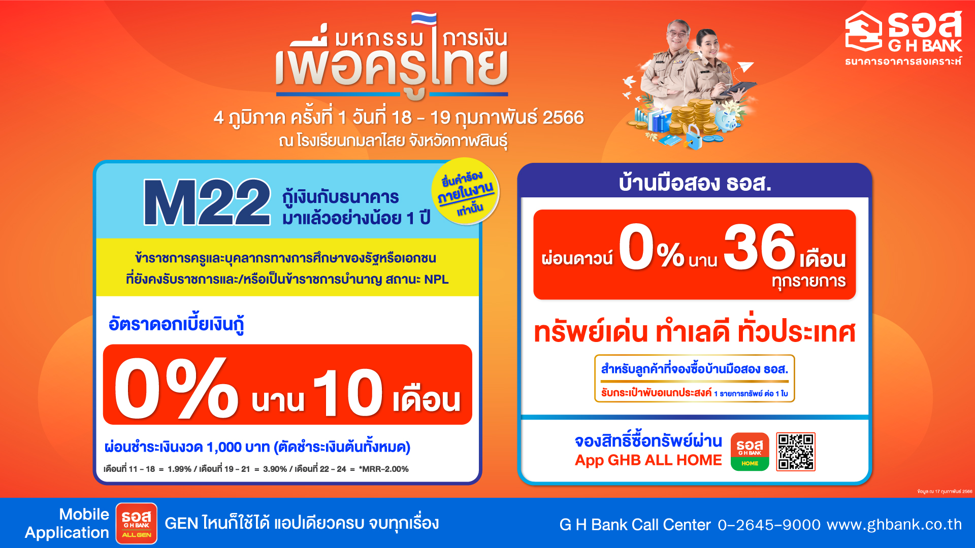นายฉัตรชัย ศิริไล กรรมการผู้จัดการ ธนาคารอาคารสงเคราะห์ (ธอส.) เปิดเผยว่า ธอส. ในฐานะสถาบันการเงินของรัฐ ที่มีพันธกิจ “ทำให้คนไทยมีบ้าน” จึงเตรียมช่วยเหลือข้าราชการครูและบุคลากรทางการศึกษา ด้วยการนำมาตรการแก้หนี้และผลิตภัณฑ์ทางการเงินเข้าร่วมงานมหกรรมการเงินเพื่อครูไทย 4 ภูมิภาค ที่จัดขึ้นโดยกระทรวงศึกษาธิการ ร่วมกับสถาบันการเงินของรัฐ สหกรณ์ออมทรัพย์ครูและหน่วยงานที่เกี่ยวข้อง จัดงานครั้งที่ 1 จัดขึ้นระหว่างวันที่ 18-19 กุมภาพันธ์ 2566 ณ โรงเรียนกมลาไสย จ.กาฬสินธุ์ โดย ธอส. นำมาตรการแก้หนี้และผลิตภัณฑ์ทางการเงินเข้าร่วมงาน ประกอบด้วย