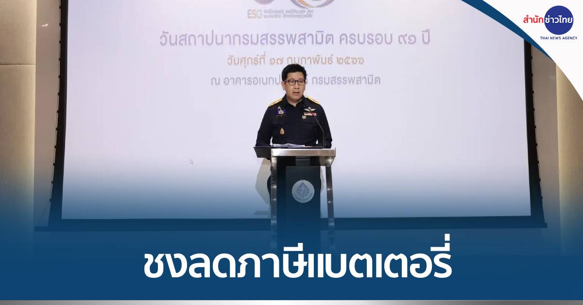 กรมสรรพสามิต 17 ก.พ.-สรรพสามิต เสนอลดภาษีแบตเตอรี่เหลือเหลือร้อยละ 1 หนุนรถยนต์ไฟฟ้าขยายตัว ต้องมีแผนรีไซเคิลดูแลสิ่งแวดล้อม เสนอใช้งบกลาง 24,000 ล้านบาท เข้มเจ้าหน้าที่ห้ามรีดไถ โทษแรงไล่ออก