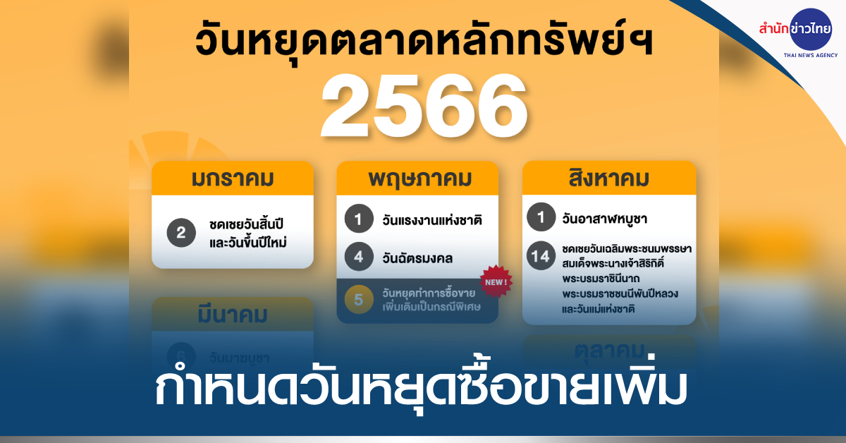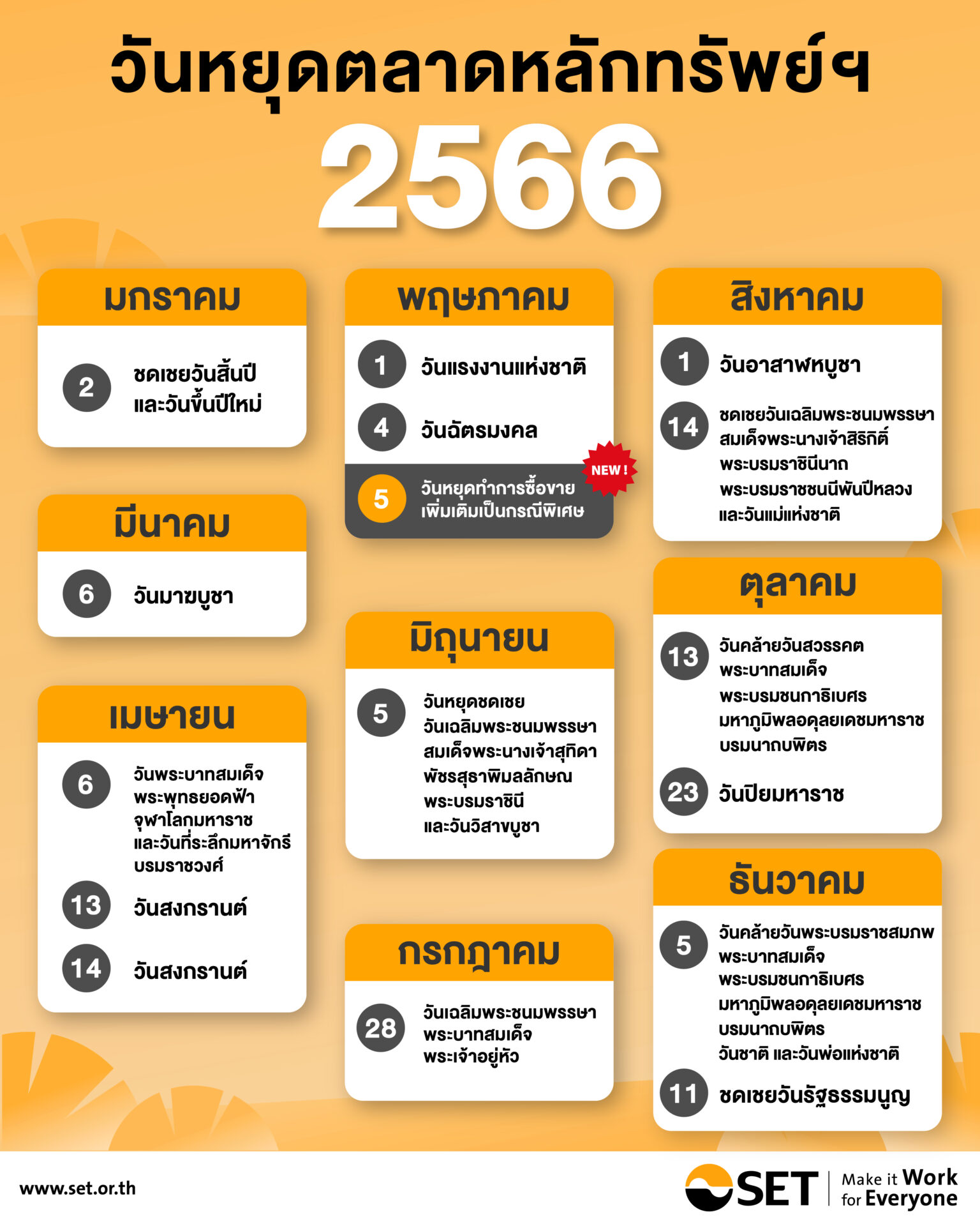 ตลาดหลักทรัพย์แห่งประเทศไทย (ตลท.) และบริษัท ตลาดสัญญาซื้อขายล่วงหน้า (ประเทศไทย) จำกัด (มหาชน) (TFEX) กำหนดให้วันศุกร์ที่ 5 พฤษภาคม 2566 เป็นวันหยุดทำการซื้อขายประจำปี 2566 เพิ่มเป็นกรณีพิเศษ ซึ่งสอดคล้องกับสำนักงานคณะกรรมการกำกับหลักทรัพย์และตลาดหลักทรัพย์ (ก.ล.ต.) และธนาคารแห่งประเทศไทย (ธปท.)