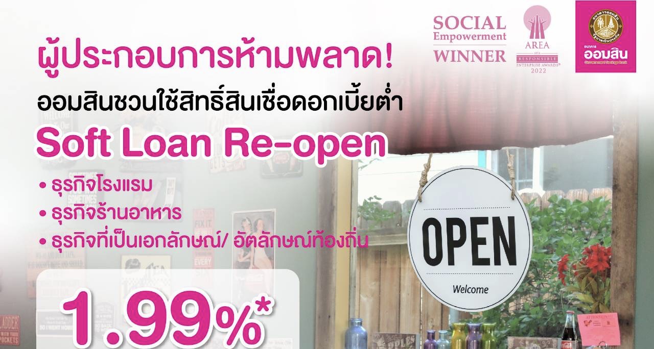 สินเชื่อ Soft Loan Re-Open เปิดให้กู้เพื่อนำเงินไปปรับปรุง ซ่อมแซมสถานประกอบการ จัดซื้อเครื่องมืออุปกรณ์หรือเป็นเงินทุนหมุนเวียนในการกลับมาเปิดกิจการอีกครั้ง โดยผู้กู้ต้องเป็นผู้ประกอบการที่เป็นบุคคลธรรมดา และนิติบุคคลที่มีบุคคลสัญชาติไทยถือหุ้นเกินร้อยละ 50 ของทุนจดทะเบียน วงเงินกู้ต่อรายสูงสุดถึง 5 ล้านบาท และมีระยะเวลากู้ได้นาน 10 ปี สามารถใช้หลักทรัพย์ หรือ บสย. อย่างใดอย่างหนึ่งในการค้ำประกันได้เต็มวงเงินกู้ หรือจะเลือกใช้ทั้งหลักทรัพย์และ บสย. ร่วมกันค้ำประกันก็ได้ คิดอัตราดอกเบี้ยคงที่ 2 ปีแรก เพียง 1.99% ต่อปี โดยปีที่ 3-10 คิดอัตราดอกเบี้ยตามประเภทหลักทรัพย์ที่ใช้ค้ำประกัน และได้รับสิทธิพิเศษปลอดชำระเงินต้นเป็นเวลานานสูงสุดถึง 2 ปี