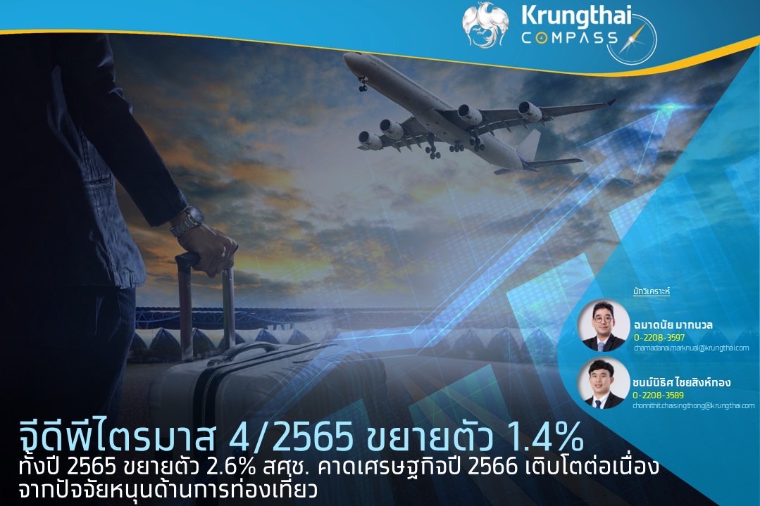 หน่วยงานวิจัย ธนาคารกรุงไทย “Krungthai COMPASS” เผยแพร่รายงาน คาดเศรษฐกิจปี 2566 มีแนวโน้มขยายตัว 3.4% เติบโตต่อเนื่องโดยมีภาคการท่องเที่ยวเป็นเครื่องยนต์สำคัญ สอดคล้องกับมุมมองของ สำนักงานสภาพัฒนาการเศรษฐกิจและสังคมแห่งชาติ (สภาพัฒน์) ที่ประเมินว่าเศรษฐกิจจะขยายตัวเร่งขึ้น โดยภาคการท่องเที่ยวมีแนวโน้มฟื้นตัวต่อเนื่องหลังจากที่ไทยมีการผ่อนคลายมาตรการควบคุมโควิด-19 ส่งผลให้กิจกรรมทางเศรษฐกิจทยอยกลับเข้าสู่ภาวะปกติ สะท้อนจากอัตราการเข้าพักแรมและจำนวนเที่ยวบินเฉลี่ยในปี 2565 ที่ฟื้นตัวกลับขึ้นมาอยู่ในระดับสูงกว่า 50% เมื่อเทียบกับช่วงก่อนโควิด-19 และคาดว่าจะมีแนวโน้มฟื้นตัวต่อเนื่องในปี 2566