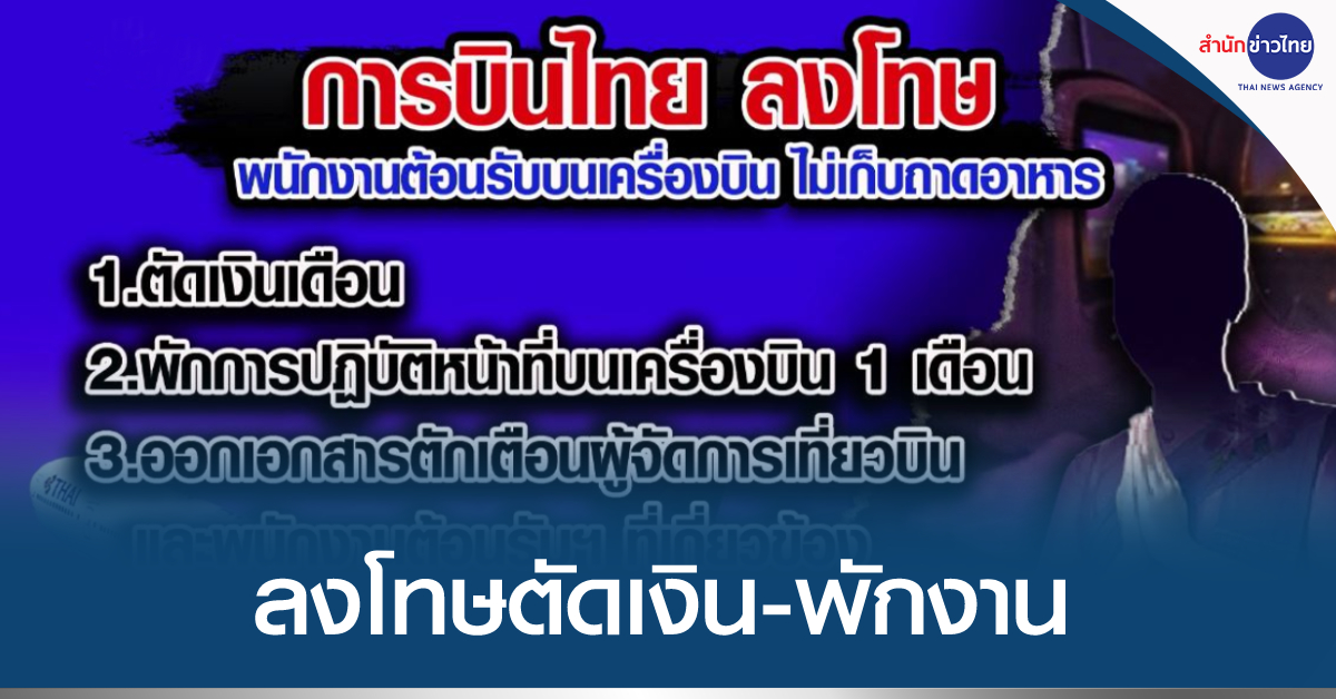 กรุงเทพฯ 22 ก.พ. – การบินไทย แจ้งผลสอบสวนพนักงานต้อนรับบนเครื่องบิน ไม่เก็บถาดอาหารขณะเครื่องบินกำลังทำการบินลงจอด พบบกพร่องในหน้าที่ สั่งตัดเงินเดือน และพักงานบนเครื่องบิน 1 เดือน