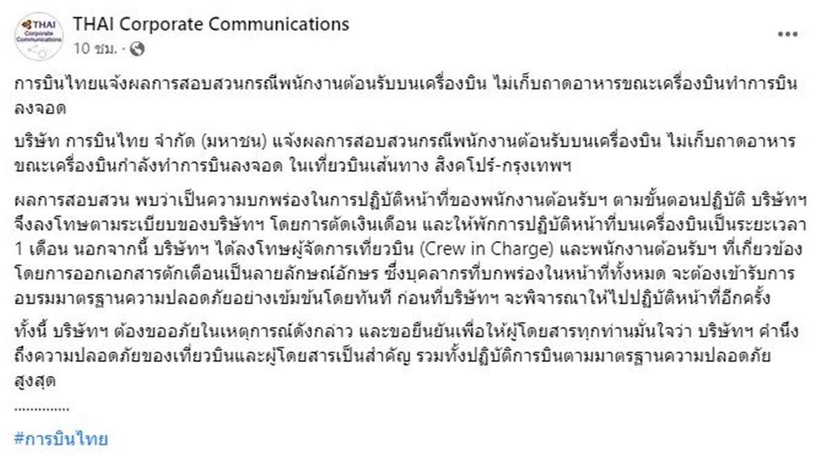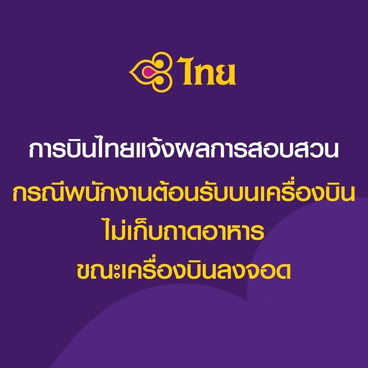 ล่าสุดเมื่อวานนี้ (21 ก.พ.66) การบินไทย แจ้งผลการสอบสวนกรณีพนักงานต้อนรับบนเครื่องบิน ไม่เก็บถาดอาหารขณะเครื่องบินกำลังทำการบินลงจอด ในเที่ยวบินเส้นทาง สิงคโปร์-กรุงเทพฯ พบว่าเป็นความบกพร่องในการปฏิบัติหน้าที่ของพนักงานต้อนรับฯ ตามขั้นตอนปฏิบัติ บริษัทฯ จึงลงโทษตามระเบียบของบริษัทฯ โดยการตัดเงินเดือน และให้พักการปฏิบัติหน้าที่บนเครื่องบินเป็นระยะเวลา 1 เดือน