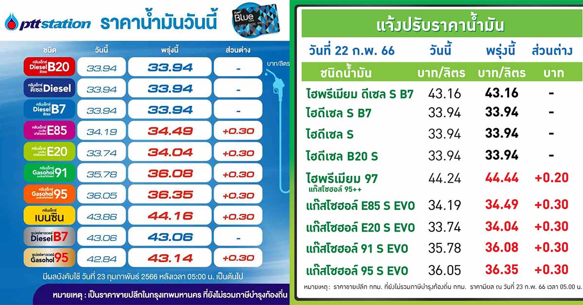 PTT Station ปรับราคาขายปลีกน้ำมันกลุ่มเบนซินและแก๊สโซฮอล์ทุกชนิดขึ้น 0.30 บาท/ลิตร ส่วนกลุ่มดีเซลคงเดิม มีผล 23 ก.พ. 2566 เวลา 05.00 น. เป็นต้นไป โดยราคาขายปลีกจะเป็นดังนี้ ULG = 44.16, GSH95 = 36.35, E20 = 34.04, GSH91 = 36.08, E85 = 34.49, พรีเมี่ยม GSH95 = 43.14, HSD-B7 = 33.94, HSD-B10 = 33.94, HSD-B20 = 33.94, พรีเมี่ยมดีเซล B7 = 43.06 บาทต่อลิตร โดยราคาขายปลีกข้างต้นยังไม่รวมภาษีบำรุงกรุงเทพมหานคร