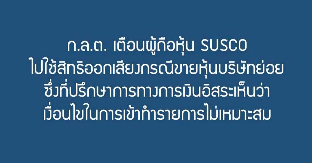 ก.ล.ต. จึงขอให้ผู้ถือหุ้นศึกษาข้อมูลอย่างรอบคอบและใช้สิทธิของผู้ถือหุ้นในการรักษาประโยชน์ของตนเอง พร้อมกับสอบถามผู้บริหาร SUSCO ถึงข้อมูลต่าง ๆ เพื่อให้มีข้อมูลครบถ้วนในการประกอบการตัดสินใจออกเสียงในการประชุมผู้ถือหุ้นด้วย .–สำนักข่าวไทย