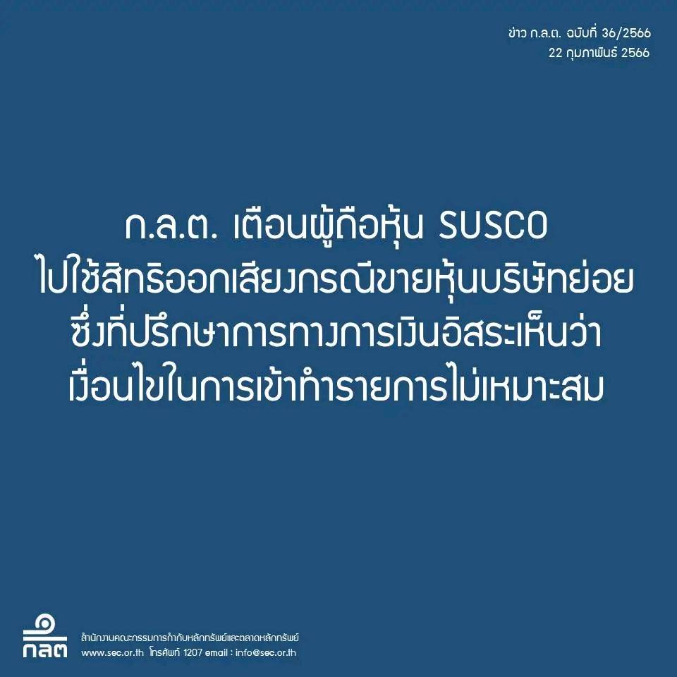 สำนักงานคณะกรรมการกำกับหลักทรัพย์และตลาดหลักทรัพย์ (ก.ล.ต.) แจ้งว่า เนื่องจากที่ประชุมคณะกรรมการบริษัทของ SUSCO เมื่อวันที่ 29 ธันวาคม 2565 มีมติให้เสนอต่อที่ประชุมผู้ถือหุ้นเพื่อพิจารณาอนุมัติการจำหน่ายหุ้นสามัญและหุ้นบุริมสิทธิของบริษัทย่อยราย SDA ให้แก่ Sinopec (Hong Kong) Limited (Sinopec) ในสัดส่วนร้อยละ 48 และร้อยละ 1 ของหุ้นที่ออกและชำระแล้ว ตามลำดับในราคา 34 ล้านเหรียญสหรัฐ โดยมีสิทธิออกเสียงร้อยละ 50 ของหุ้นทั้งหมดที่จำหน่ายแล้ว