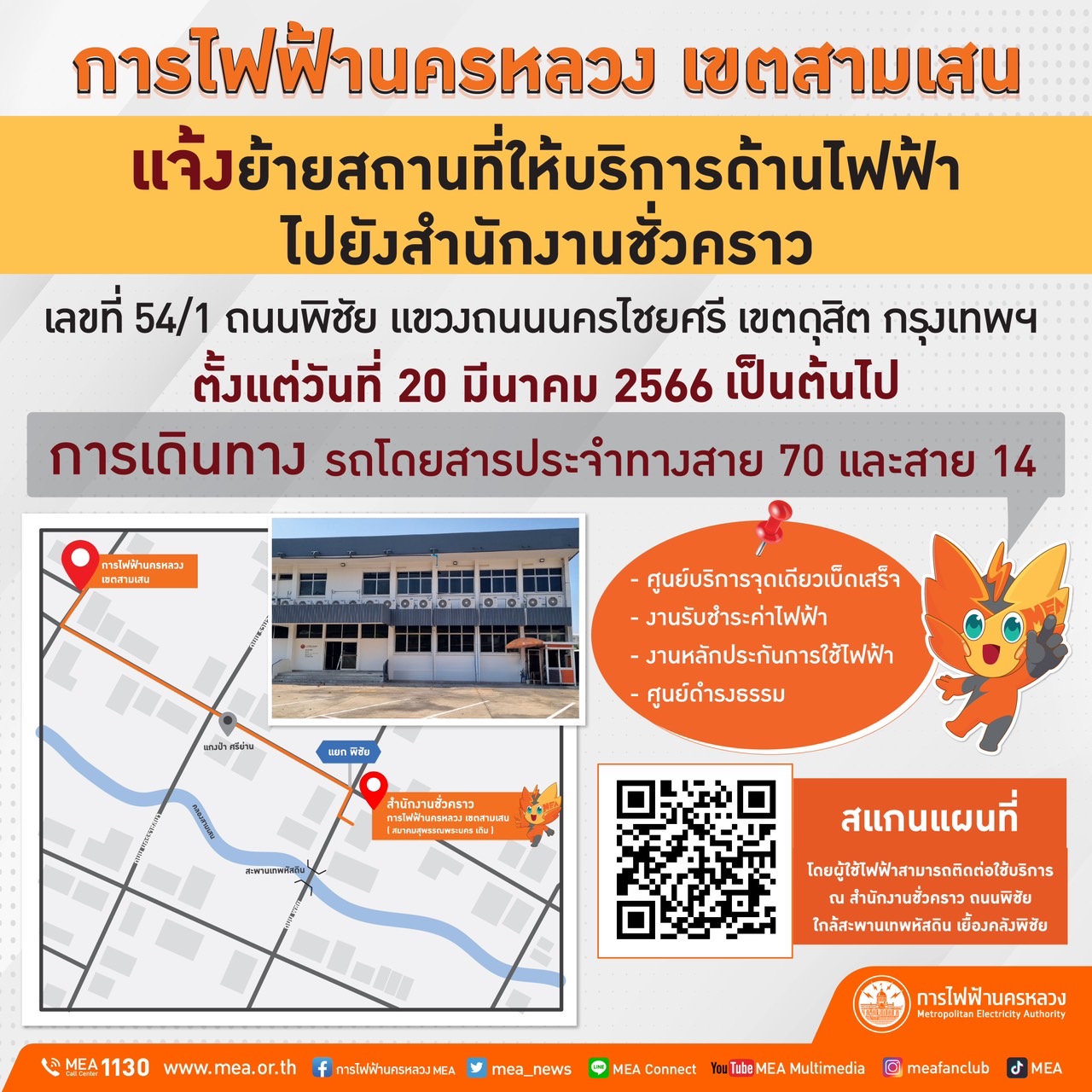 MEA หรือการไฟฟ้านครหลวง เขตสามเสน แจ้งย้ายที่ตั้งงานบริการด้านไฟฟ้าชั่วคราว ตั้งแต่วันที่ 20 มีนาคม 2566 เป็นต้นไป