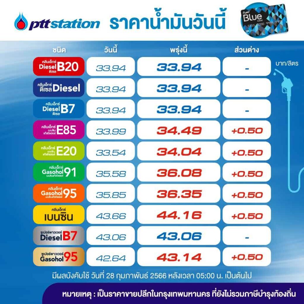 PTT Station ปรับราคาขายปลีกน้ำมันกลุ่มเบนซินและแก๊สโซฮอล์ทุกชนิดขึ้น 0.50 บาท/ลิตร ส่วนกลุ่มดีเซลคงเดิม มีผล 28 ก.พ. 2566 เวลา 05.00 น. เป็นต้นไป โดยราคาขายปลีกจะเป็นดังนี้ ULG = 44.16, GSH95 = 36.35, E20 = 34.04, GSH91 = 36.08, E85 = 34.49, พรีเมี่ยม GSH95 = 43.14, HSD-B7 = 33.94, HSD-B10 = 33.94, HSD-B20 = 33.94, พรีเมียมดีเซล B7 = 43.06 บาทต่อลิตร โดยราคาขายปลีกข้างต้นยังไม่รวมภาษีบำรุงกรุงเทพมหานคร