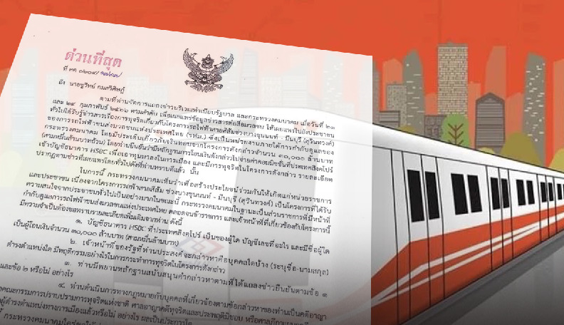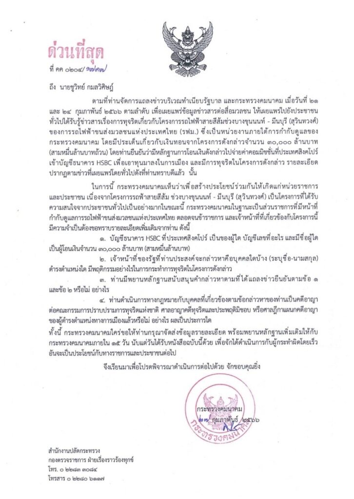 กรุงเทพฯ 28 ก.พ.- กระทรวงคมนาคม ร่อนเอกสารด่วน ถึง “ชูวิทย์ กมลวิศิษฎ์” ขอให้ส่งหลักฐานอ้างอิงถึงปัญหาการทุจจริต “รถไฟฟ้าสายสีส้ม” 30,000 ล้านบาท ภายใน 15 วัน