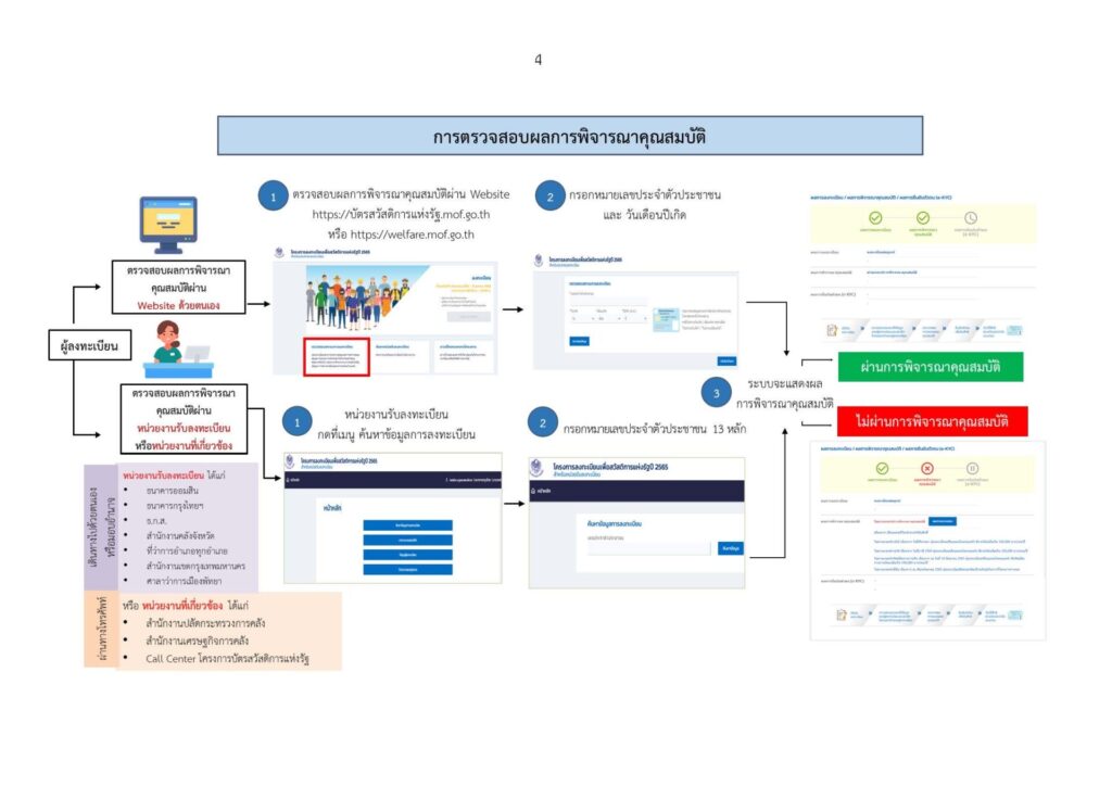1. ผู้ลงทะเบียนสามารถตรวจสอบผลการพิจารณาคุณสมบัติด้วยตนเอง ผ่านทางเว็บไซต์ https://บัตรสวัสดิการแห่งรัฐ.mof.go.th หรือ https://welfare.mof.go.th ได้ตั้งแต่เวลา 6.00 น. ถึง 23.00 น. ของทุกวัน