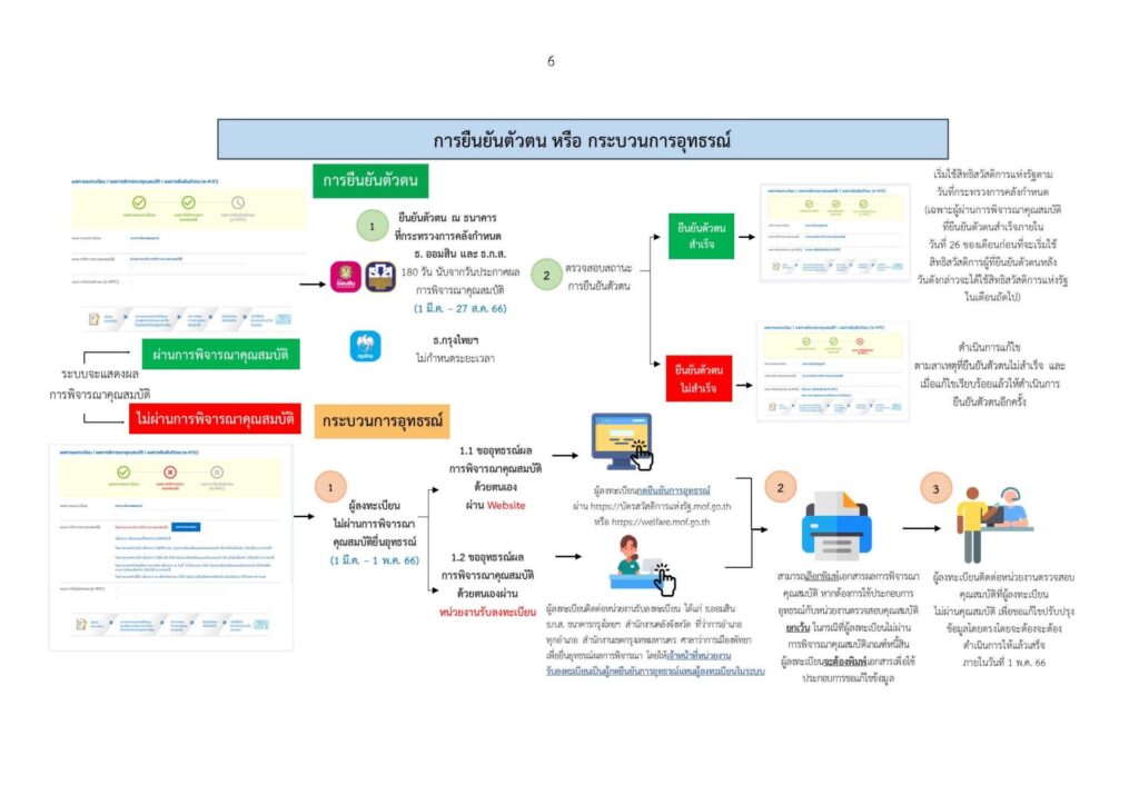 2. ผู้ลงทะเบียนสามารถตรวจสอบผลการพิจารณาคุณสมบัติผ่านหน่วยงานรับลงทะเบียนทั้ง 7 หน่วยงาน ได้แก่ สาขาของธนาคารเพื่อการเกษตรและสหกรณ์การเกษตร (ธ.ก.ส.) ธนาคารออมสิน ธนาคารกรุงไทย จำกัด (มหาชน) (ธนาคารกรุงไทยฯ) สำนักงานคลังจังหวัดทั้ง 76 จังหวัดทั่วประเทศ สังกัดกรมบัญชีกลาง ที่ว่าการอำเภอทั้ง 878 อำเภอทั่วประเทศ ภายใต้กระทรวงมหาดไทย สำนักงานเขตกรุงเทพมหานคร ทั้ง 50 เขต และศาลาว่าการเมืองพัทยาเมืองพัทยา ตามวันและเวลาทำการของแต่ละหน่วยงานสำหรับการตรวจสอบผลการพิจารณาคุณสมบัติในช่วงวันหยุดเสาร์ – อาทิตย์ และวันหยุดนักขัตฤกษ์ให้ขึ้นอยู่กับการพิจารณาของหน่วยงานรับลงทะเบียนแต่ละแห่ง