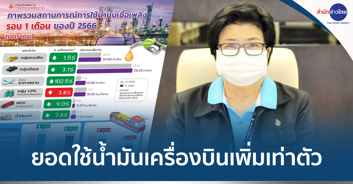 กรุงเทพฯ 2 มี.ค.-ยอดใช้น้ำมันมกราคม 2566 อยู่ที่ 161.49 ล้านลิตร/วัน เพิ่มขึ้นร้อยละ 6.2 โดยยอดใช้น้ำมันเครื่องบินเพิ่มขึ้นเท่าตัวจากเปิดเมือง
