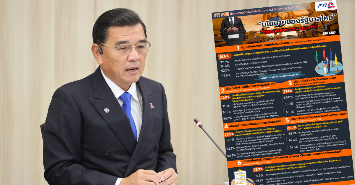 นายมนตรี มหาพฤกษ์พงศ์ รองประธานสภาอุตสาหกรรมแห่งประเทศไทย (ส.อ.ท.) เปิดเผยผลการสำรวจ FTI Poll ฟเดือนกุมภาพันธ์ 2566 ภายใต้หัวข้อ “นโยบายรัฐบาลใหม่ที่ภาคอุตสาหกรรมอยากได้” พบว่า ภาคอุตสาหกรรมมองว่าการเลือกตั้งที่จะมีขึ้นในช่วงเดือนพฤษภาคมที่จะถึงนี้จะเป็นจุดเปลี่ยนที่สำคัญที่จะได้รัฐบาลใหม่ และมีนโยบายใหม่ ที่จะช่วยขับเคลื่อนเศรษฐกิจและความเป็นอยู่ของประชาชน ซึ่งจากการสำรวจความเห็นของผู้บริหาร ส.อ.ท. ส่วนใหญ่ คาดหวังให้รัฐบาลใหม่ให้ความสำคัญกับกรอบนโยบายใน 5 เรื่อง ดังนี้