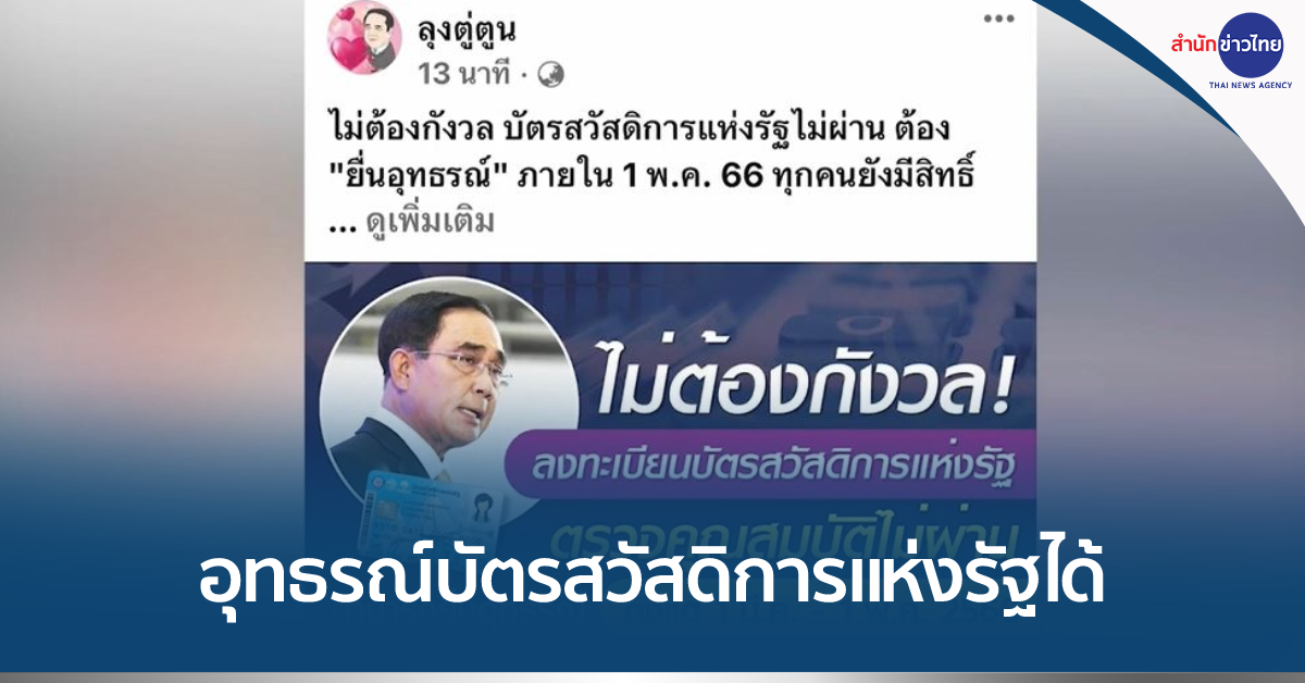 แฟนเพจเฟซบุ๊กลุงตู่ตูน โพสต์ข้อความไม่ต้องกังวล บัตรสวัสดิการแห่งรัฐไม่ผ่าน ต้อง “ยื่นอุทธรณ์” ภายใน 1 พฤษภาคมนี้ พร้อมแนะนำขั้นตอนการลงทะเบียนอุทธรณ์ใหม่ คือ สำหรับผู้ลงทะเบียนบัตรสวัสดิการแห่งรัฐที่ตรวจสอบผลการพิจารณาคุณสมบัติตามโครงการฯ ปี 2565 แล้ว พบว่าไม่ผ่านเกณฑ์การพิจารณาคุณสมบัติตามโครงการฯ ปี 2565 สามารถยื่นขออุทธรณ์ผลการพิจารณาคุณสมบัติได้ตั้งแต่วันที่ 1 มีนาคม-1 พฤษภาคม 2566 ผ่าน 2 ช่องทาง ได้แก่