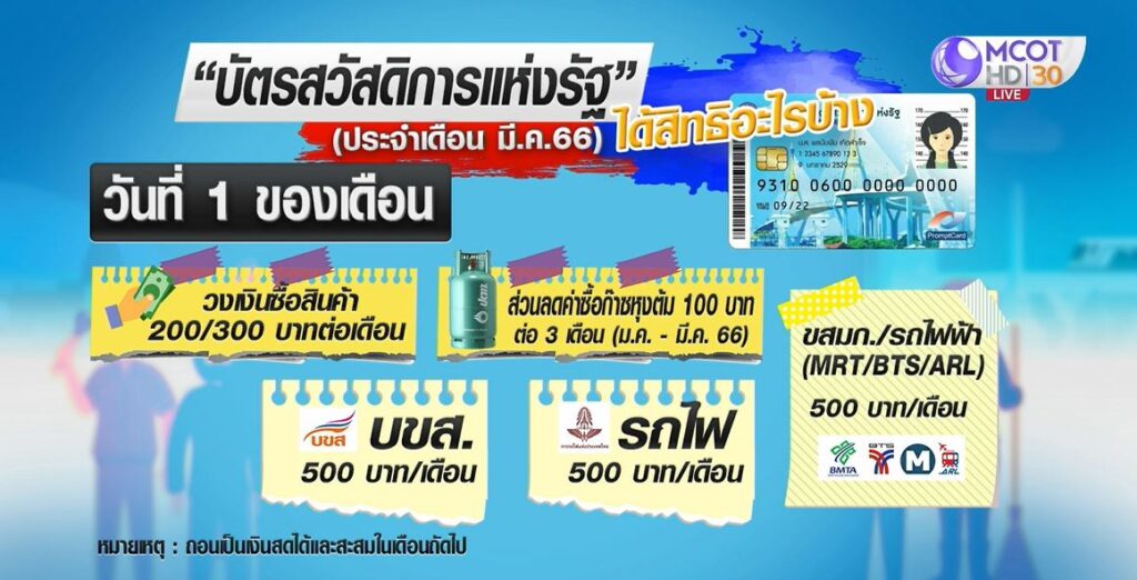 ทั้งนี้ กรมบัญชีกลางได้ตั้งวงเงินสิทธิให้แก่ผู้ถือบัตรสวัสดิการแห่งรัฐ ให้แก่ผู้ถือบัตรประจำเดือนมีนาคม 2566 ประกอบด้วย ทุกวันที่ 1 ของเดือน (เป็นวงเงินสิทธิไม่สามารถถอนเป็นเงินสดได้ และไม่สะสมในเดือนถัดไป) วงเงินซื้อสินค้า 200/300 บาทต่อเดือน วงเงินส่วนลดค่าซื้อก๊าซหุงต้ม 100 บาทต่อ 3 เดือน (ม.ค.-มี.ค. 66)