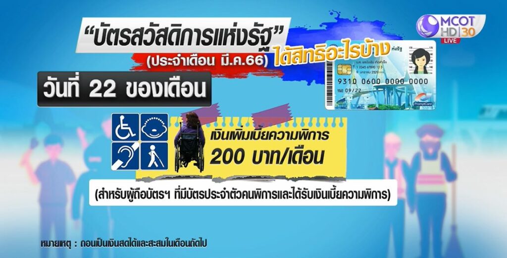 เงินเพิ่มเบี้ยความพิการ 200 บาทต่อเดือน (สำหรับผู้ถือบัตรสวัสดิการแห่งรัฐที่มีบัตรประจำตัวคนพิการและได้รับเงินเบี้ยความพิการ) .-สำนักข่าวไทย