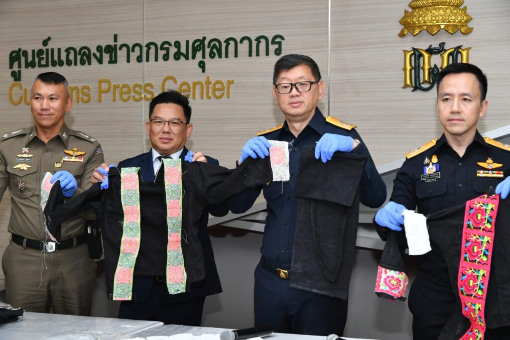 ทั้งนี้ เมื่อวันที่ 6 มี.ค.ที่ผ่านมา กรมศุลกากร โดยสำนักงานศุลกากรตรวจสินค้าท่าอากาศยานสุวรรณภูมิ ภายใต้การปฏิบัติงานของชุด AITF (AIRPORT INTERDICTION TASK FORCE) ประกอบด้วย เจ้าหน้าที่สำนักงานคณะกรรมการป้องกันและปราบปรามยาเสพติด กองบัญชาการตำรวจปราบปรามยาเสพติด และศูนย์รักษาความปลอดภัยแห่งชาติ ได้ประมวลข้อมูลเกี่ยวกับความเสี่ยงในการลักลอบนำยาเสพติดออกนอกราชอาณาจักร พบพัสดุต้องสงสัยเตรียมส่ง HONG KONG จำนวน 29 หีบห่อ สำแดงสินค้าเป็นของใช้ตามบ้านเรือน เสื้อผ้า เครื่องสำอาง เครื่องประดับ และเครื่องขจัดขน ซึ่งจากการเปิดตรวจสินค้าที่เป็นเสื้อผ้าชาวเขาและผ้าเตี่ยว จำนวน 6 หีบห่อ พบว่าบริเวณปลายแขนเสื้อทั้งสองข้างมีความหนาผิดปกติและมีกลิ่นฉุน จึงทำการเลาะตะเข็บแขนเสื้อและผ้าเตี่ยวออก พบสารที่มีลักษณะเป็นผงบรรจุอยู่ในแถบผ้าดิบที่มีการเย็บติดกับแขนเสื้อและผ้าเตี่ยว จากนั้นจึงนำวัตถุต้องสงสัยมาทดสอบเบื้องต้นด้วยน้ำยาเคมี (ONCB 051 Marquis Reagent) และเครื่อง Handheld Raman Spectrometer แสดงผลเป็นยาเสพติดให้โทษประเภท 1 เฮโรอีน (HEROIN) น้ำหนักของยาเสพติด 43.40 กิโลกรัม มูลค่า 107,500,000.00 บาท