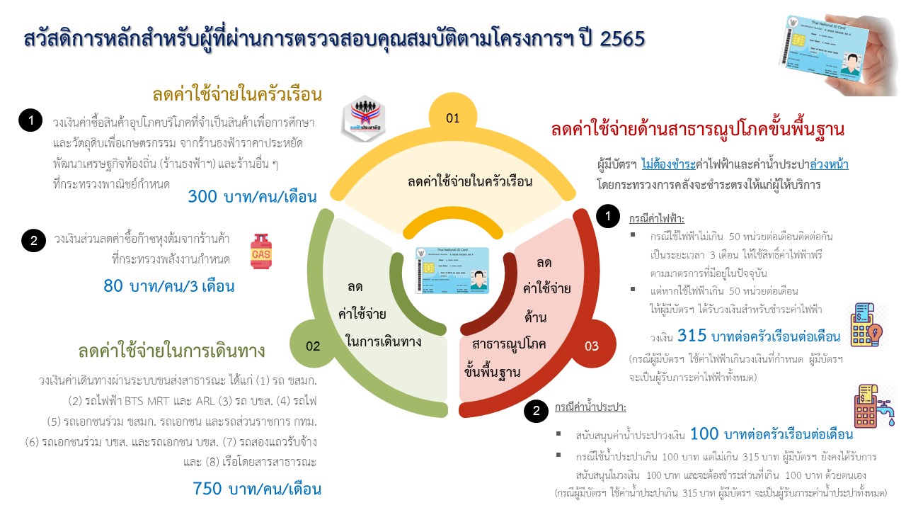 - มาตรการบรรเทาภาระค่าไฟฟ้า อุดหนุนค่าไฟฟ้าจำนวน 315 บาทต่อครัวเรือนต่อเดือน กรณีที่ใช้ไฟฟ้าเกินวงเงินที่กำหนด ผู้มีบัตรสวัสดิการแห่งรัฐ (ผู้มีบัตรฯ) ที่ได้รับสิทธิจะเป็นผู้รับภาระค่าไฟฟ้าทั้งหมด