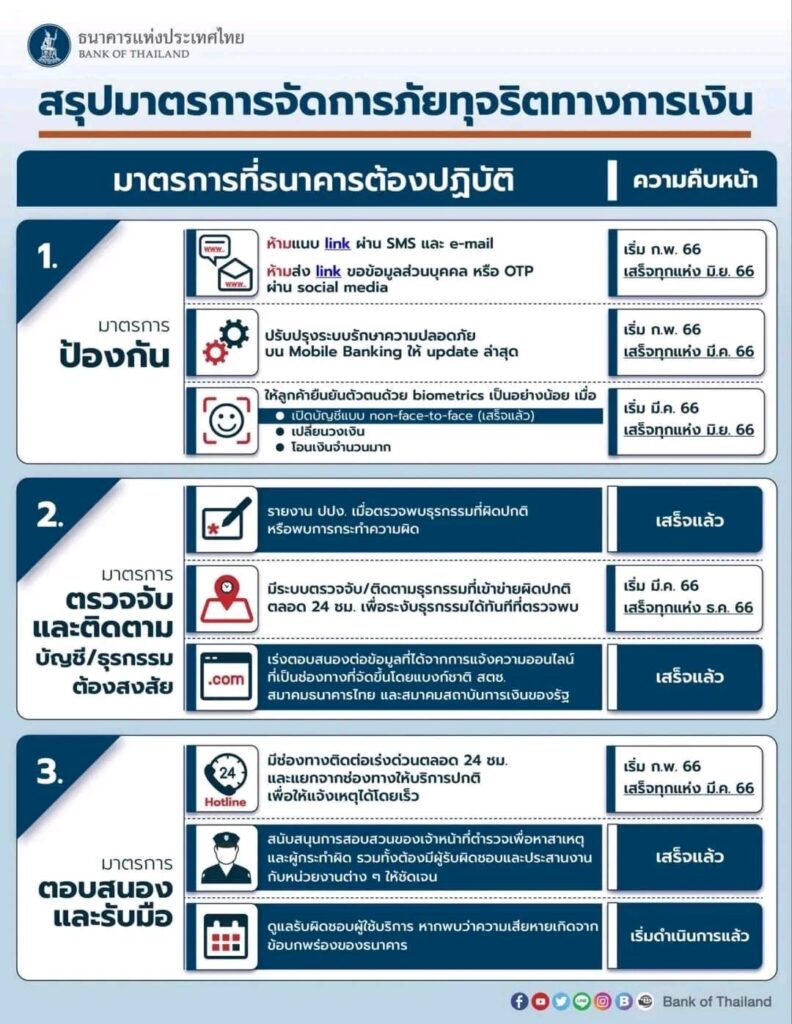 - มาตรการป้องกัน เพื่อปิดช่องทางที่มิจฉาชีพจะเข้าถึงประชาชนได้มากขึ้น ให้สถาบันการเงินงดส่งลิงก์ทุกประเภทผ่าน SMS อีเมล และงดส่งลิงก์ขอข้อมูลสำคัญ เช่น ชื่อผู้ใช้งาน รหัสผ่าน และเลขบัตรประชาชนผ่านโซเชียลมีเดียจำกัดจำนวนบัญชีผู้ใช้งาน mobile banking (username)ต่อ 1 อุปกรณ์เท่านั้น ต้องแจ้งเตือนก่อนทำธุรกรรมบนmobile banking ทุกครั้ง และพัฒนาระบบความปลอดภัย ให้เท่าทันภัยการเงินรูปแบบใหม่อยู่ตลอดเวลา ตลอดจนต้องยกระดับความเข้มงวดในกระบวนการยืนยันตัวตนขั้นต่ำด้วยการใช้เทคโนโลยีเปรียบเทียบข้อมูลอัตลักษณ์ทางกายภาพของลูกค้า (biometrics) เช่น สแกนใบหน้า ในกรณีลูกค้าขอเปิดบัญชีโดยผ่านแอปพลิเคชัน (non-face-to-face) หรือทำธุรกรรมผ่านโมบายแบงก์กิ้ง ในเงื่อนไขที่กำหนดเช่น โอนเงินมากกว่า 50,000 บาท หรือปรับเพิ่มวงเงินทำธุรกรรมต่อวันเป็นตั้งแต่ 50,000 บาทขึ้นไป นอกจากนี้ จะกำหนดเพดานวงเงินถอน/โอนสูงสุดต่อวันให้เหมาะสมตามระดับความเสี่ยงของกลุ่มผู้ใช้บริการ โดยลูกค้าสามารถขอปรับได้ตามความจำเป็น และต้องยืนยันตัวตน