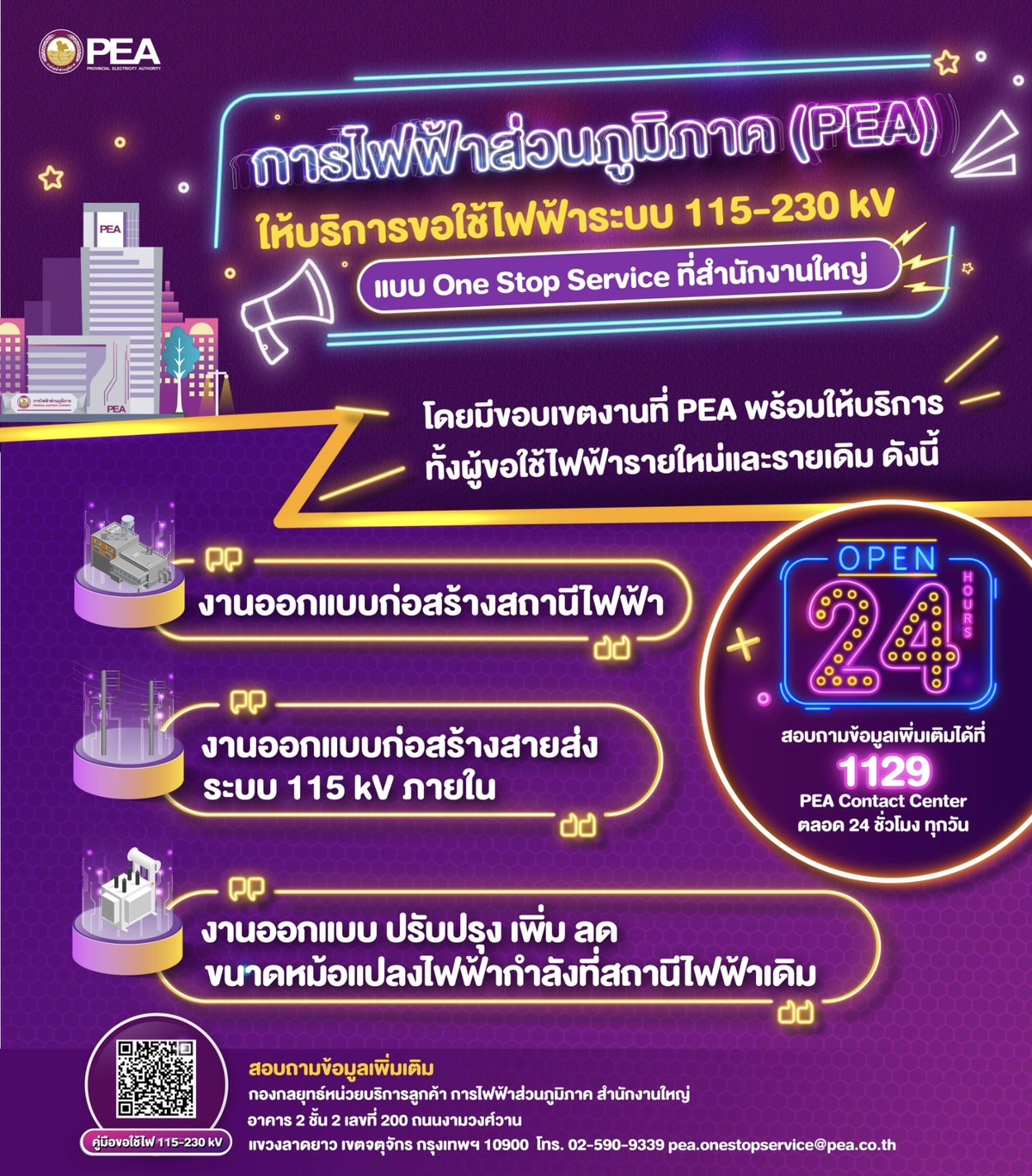การไฟฟ้าส่วนภูมิภาค (PEA) ให้บริการขอใช้ไฟฟ้าระบบ 115-230 kV ทั้งผู้ใช้ไฟฟ้ารายใหม่และรายเดิม แบบ One Stop Service ที่สำนักงานใหญ่ ดังนี้