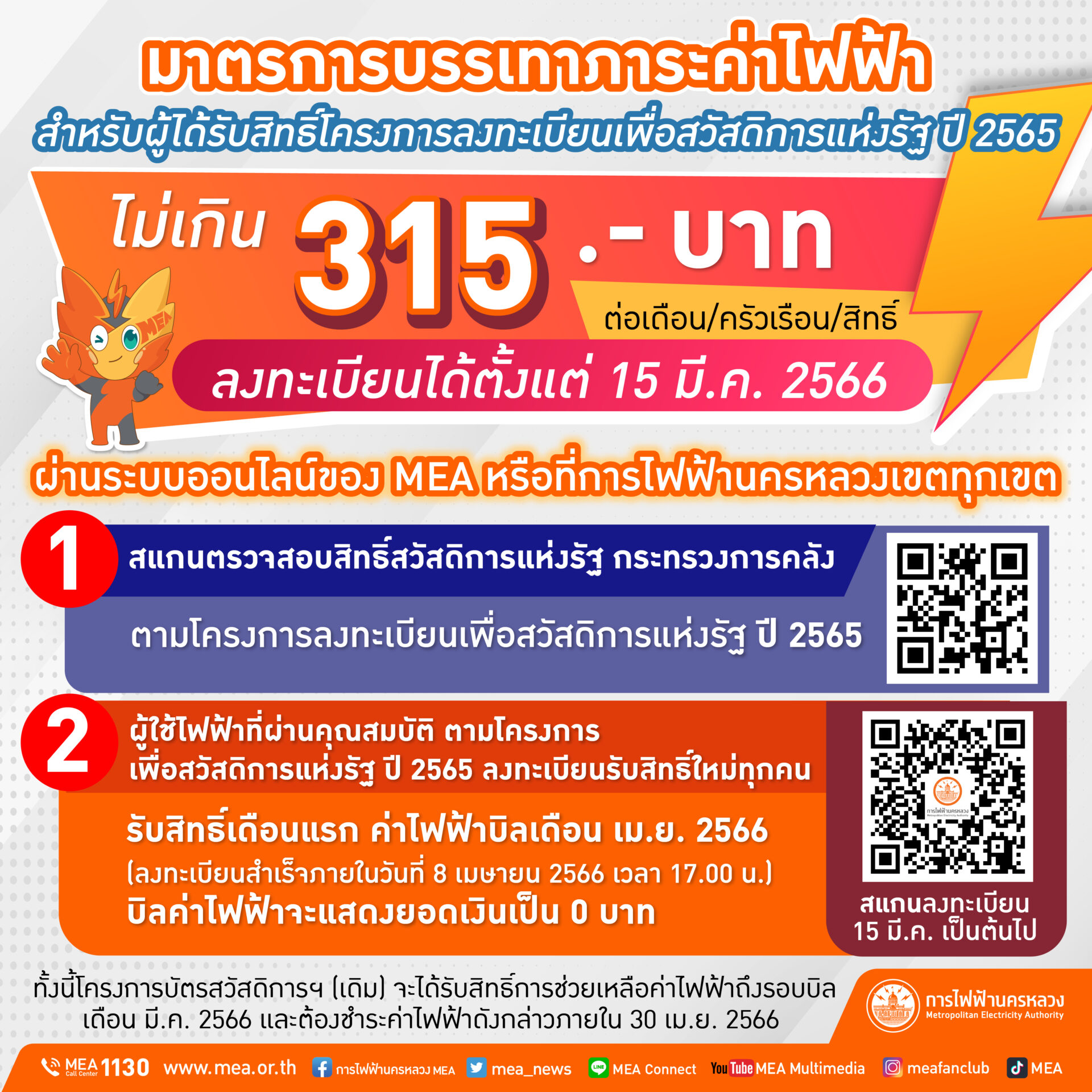 MEA แจ้งมาตรการบรรเทาภาระค่าไฟฟ้า ไม่เกิน 315 บาท ต่อเดือน/ครัวเรือน/สิทธิ์ สำหรับผู้ได้รับสิทธิ์โครงการลงทะเบียนเพื่อสวัสดิการแห่งรัฐ ปี 2565