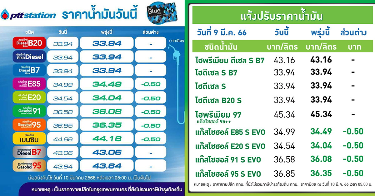 PTT Station ปรับราคาขายปลีกน้ำมันกลุ่มเบนซินและแก๊สโซฮอล์ทุกชนิดลง 0.50 บาท/ลิตร ส่วน Super Power GSH95 และกลุ่มดีเซลคงเดิม มีผล 10 มี.ค. 2566 เวลา 05.00 น. เป็นต้นไป โดยราคาขายปลีกจะเป็นดังนี้ ULG = 44.16, GSH95 = 36.35, E20 = 34.04, GSH91 = 36.08, E85 = 34.49, พรีเมี่ยม GSH95 = 43.64, HSD-B7 = 33.94, HSD-B10 = 33.94, HSD-B20 = 33.94, พรีเมี่ยมดีเซล B7 = 43.06 บาทต่อลิตร โดยราคาขายปลีกข้างต้นยังไม่รวมภาษีบำรุงกรุงเทพมหานคร