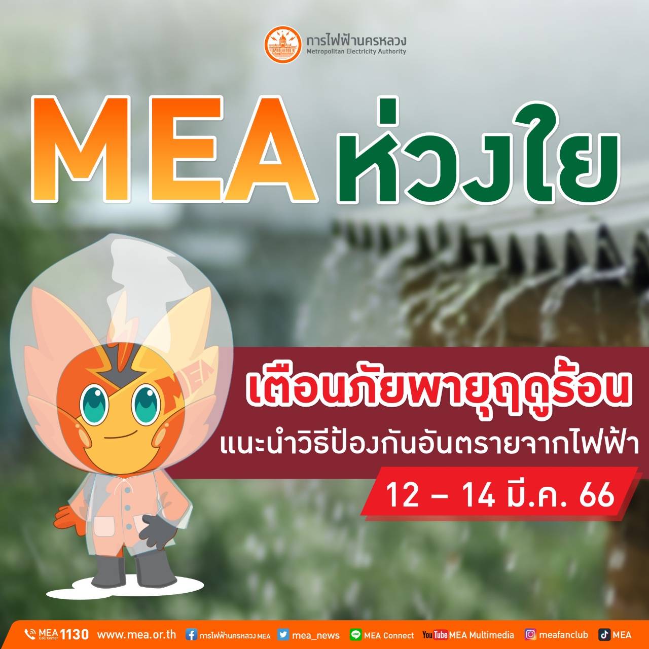 ทั้งนี้ หากประชาชนพบเห็นสายไฟฟ้าหรืออุปกรณ์ไฟฟ้าของ MEA ชำรุด หรืออยู่ในสภาพที่ไม่ปลอดภัย สามารถแจ้งเจ้าหน้าที่ MEA ได้ทุกเขต หรือที่ศูนย์บริการข้อมูลผู้ใช้ไฟฟ้า การไฟฟ้านครหลวง MEA Call Center 1130 รวมถึงสามารถแจ้งผ่านช่องทางโซเชียลมีเดีย ได้แก่ Facebook : การไฟฟ้านครหลวง MEA, Line : MEA Connect, Twitter : @mea_news หรือ แจ้งเหตุไฟฟ้าขัดข้องผ่าน MEA Smart Life ซึ่งเป็นแอปพลิเคชันบนสมาร์ตโฟนระบบ iOS และ Android ของ MEA ได้ตลอด 24 ชั่วโมง ดาวน์โหลดฟรี คลิก https://onelink.to/measmartlife