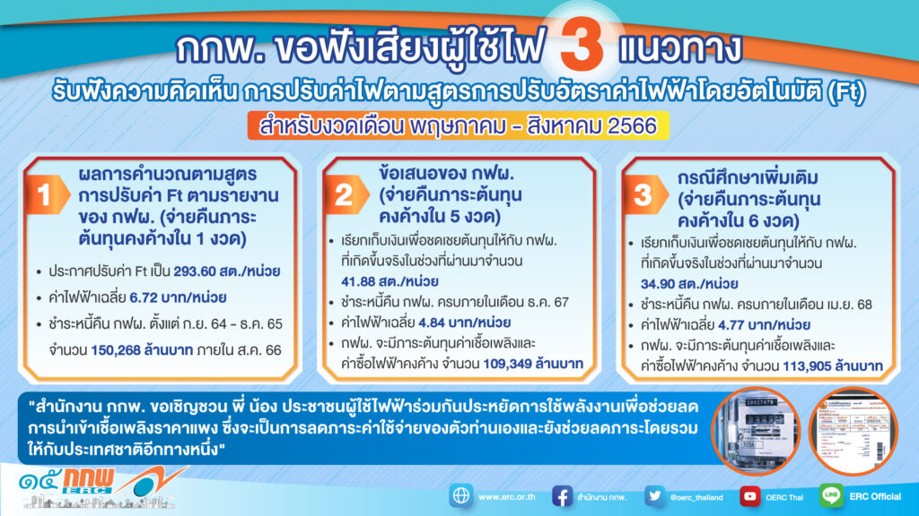 ในการพิจารณาค่าเอฟทีในงวดเดือน พ.ค. – ส.ค. 2566 เป็นการประมาณการค่าใช้จ่ายที่จะเกิดขึ้นโดยอ้างอิงจากข้อมูลจริงเฉลี่ยในเดือน มกราคม 2566 ซึ่งเป็นช่วงเวลาที่สถานการณ์ราคาพลังงานในตลาดโลกอยู่ในช่วงขาลงปริมาณก๊าซธรรมชาติในอ่าวไทยทยอยเข้าสู่ระบบเพิ่มขึ้น และค่าเงินบาทแข็งค่าขึ้น กกพ. จึงเปิดรับฟังความเห็นการทยอยคืนภาระค่าต้นทุนคงค้างให้กับ กฟผ. โดยยังคงสามารถรักษาระดับค่าไฟฟ้าในอัตราที่เหมาะสมเพื่อให้ กฟผ. มีสภาพคล่องทางการเงินที่ดีขึ้นพร้อมรองรับสถานการณ์พลังงานโลกและอัตราแลกเปลี่ยนที่ยังคงมีความผันผวนอย่างรุนแรง จากสถานการณ์รัสเซียยูเครน จากสถานการณ์การกดดันจากประเทศมหาอำนาจในด้านต่างๆ บนเวทีโลก และจากความต้องการพลังงานที่จะเพิ่มมากขึ้นในช่วงปลายปี