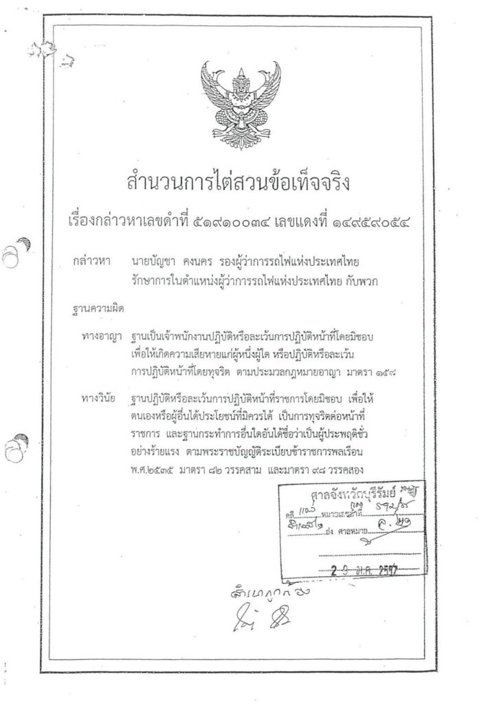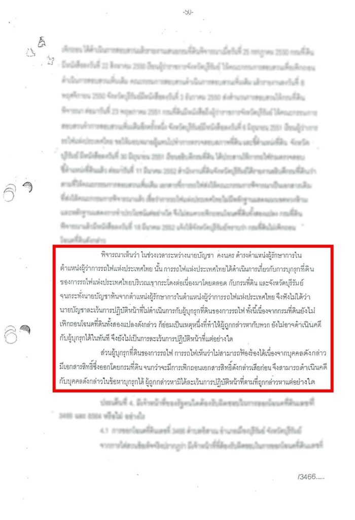 ทั้งนี้ ในช่วงเวลาระหว่างที่ผู้ถูกกล่าวหาดำรงตำแหน่งผู้รักษาในตำแหน่งผู้ว่าการรถไฟแห่งประเทศไทย นั้น การรถไฟแห่งประเทศไทยได้ดำเนินการเกี่ยวกับการบุกรุกที่ดินของการรถไฟแห่งประเทศไทยบริเวณเขากระโดงต่อเนื่องมาโดยตลอด กับกรมที่ดิน และจังหวัดบุรีรัมย์ จนกระทั่งผู้ถูกกล่าวหาพ้นจากตำแหน่งผู้รักษาการในตำแหน่งผู้ว่าการรถไฟแห่งประเทศไทย จึงฟังไม่ได้ว่าผู้ถูกกล่าวหาละเว้นการปฏิบัติหน้าที่ไม่ดำเนินการกับผู้บุกรุกที่ดินของการรถไฟฯ ทั้งนี้เนื่องจากกรมที่ดินยังไม่เพิกถอนโฉนดที่ดินทั้งสองแปลงดังกล่าว ก็ย่อมเป็นเหตุหนึ่งที่ทำให้ผู้ถูกกล่าวหากับพวกยังไม่อาจดำเนินคดีกับผู้บุกรุกได้ในทันที จึงยังไม่เป็นการละเว้นการปฏิบัติหน้าที่แต่อย่างใด ส่วนผู้บุกรุกที่ดินของการรถไฟฯ การรถไฟแห่งประเทศไทยเห็นว่าไม่สามารถฟ้องร้องได้เนื่องจากบุคคลดังกล่าวมีเอกสารสิทธิ์ ซึ่งออกโดยกรมที่ดิน จนกว่าจะมีการเพิกถอนเอกสารสิทธิ์ดังกล่าวเสียก่อน จึงสามารถดำเนินคดีกับบุคคลดังกล่าวในข้อหาบุกรุกได้ ผู้ถูกกล่าวหามิได้ละเว้นการปฏิบัติหน้าที่ตามที่ถูกกล่าวหาแต่อย่างใด ซึ่งหมายความว่าการรถไฟฯ จะสามารถดำเนินการกับผู้บุกรุกในที่ดินของการรถไฟฯ ได้ภายหลังจากกรมที่ดินดำเนินการเพิกถอนเอกสารสิทธิ์ดังกล่าวแล้ว