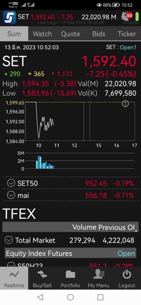 กรุงเทพฯ 13 มี.ค. –หุ้นไทยเปิดดิ่ง นักลงทุน หวั่นผลกระทบธนาคารสหรัฐ “SVB-Signature” ล้มละลาย ดัชนีหุ้นไทย (SET) เปิดตลาดเช้าวันนี้ ( 13 มี.ค.) อยู่ที่ 1,587.78 จุด ปรับตัวลง 11.87 จุด หรือ 0.74% และเมื่อเวลา 10.52 น. เคลื่อนไหว ที่ อยู่ที่ 1,587.78 จุด ปรับตัวลง 11.87 จุด