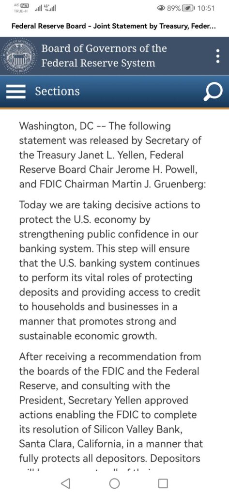 ทั้งนี้ นายเจอโรม พาวเวล ประธานเฟด พร้อมด้วย นางเจเน็ต เยลเลน รัฐมนตรีคลังสหรัฐ และนายมาร์ติน กรุนเบิร์กประธานบรรษัทค้ำประกันเงินฝากของรัฐบาลกลางสหรัฐ (FDIC) ออกแถลงการณ์ร่วมกันในช่วงเช้าวันนี้ตามเวลาไทยว่าตัดสินใจใช้นโยบายที่เด็ดขาดเพื่อปกป้องเศรษฐกิจของสหรัฐ ด้วยการสร้างความเชื่อมั่นในระบบธนาคาร