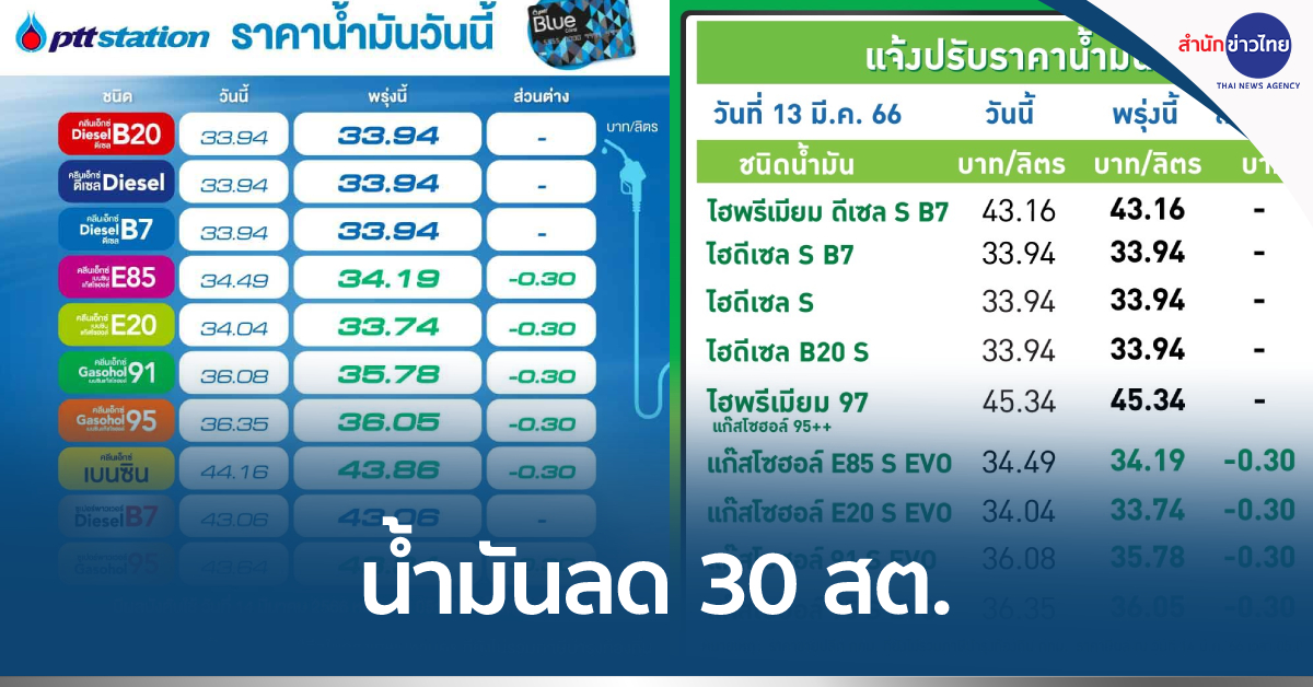 กรุงเทพฯ 13 มี.ค. – ผู้ค้าแจ้งปรับลดราคาขายปลีกน้ำมันกลุ่มเบนซินและแก๊สโซฮอล์ทุกชนิด 30 สต./ลิตร ส่วนกลุ่มดีเซลคงเดิม มีผลวันพรุ่งนี้ (14 มี.ค. 66) ตั้งแต่เวลา 05.00 น. เป็นต้นไป